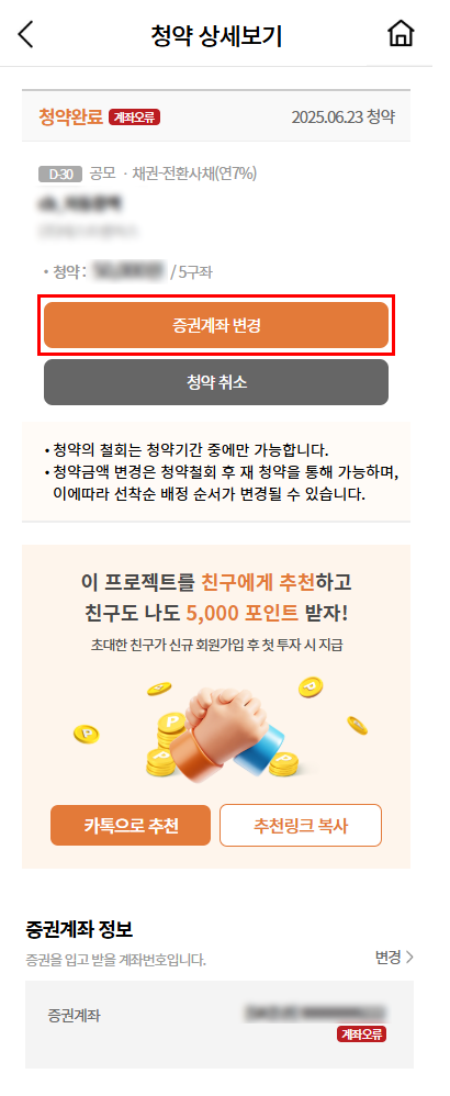 A. ① 증권계좌 미등록이나 계좌 정보에 오류가 생긴 투자자 분들께는 카카오톡 알림톡을 보내드립니다. 알림톡 내용을 확인하신 후 [증권계좌 변경하기] 버튼을 눌러 변경하시면 됩니다.