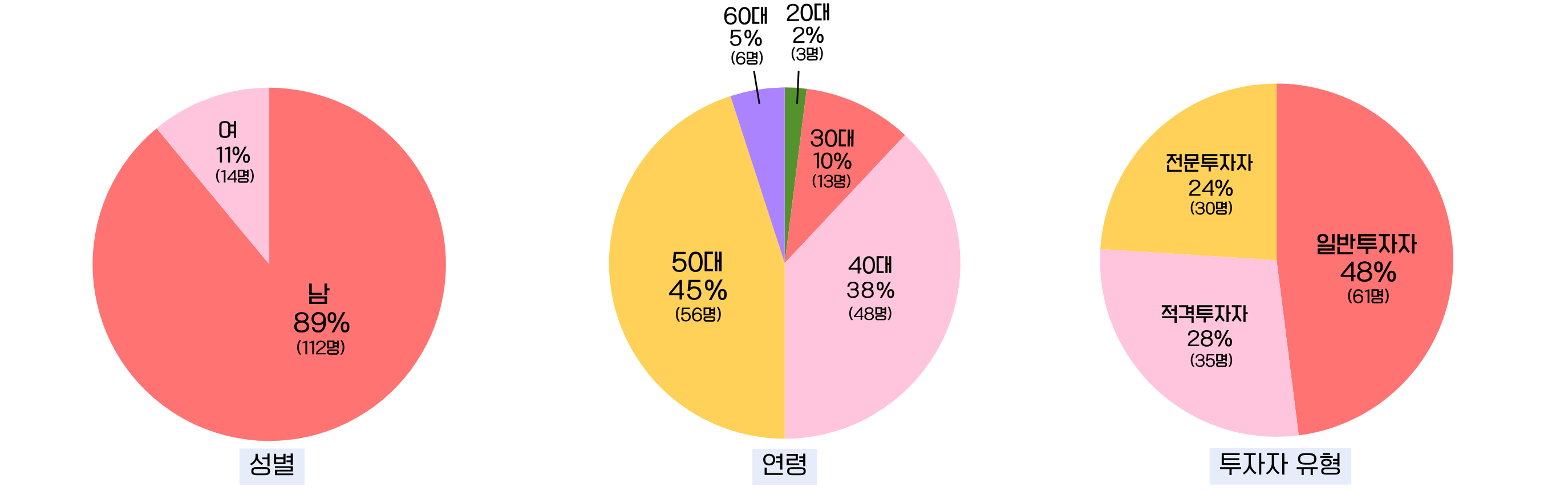 루벤티스 프로젝트는 기간 연장 없이 1회 증액을 거쳐 최종 316,330,080원(목표 금액의 105.4%)을 모집하였습니다. 프로젝트 참여자 총 126명 중 남성은 112명(89%), 여성은 14명(11%)으로 나타났으며, 40~50대 연령층이 전체의 83%(104명)를 차지하였습니다. 투자자 유형별로는 일반투자자가 48%(61명)로 가장 많았고, 적격투자자 28%(35명), 전문투자자 24%(30명) 순이었습니다.
