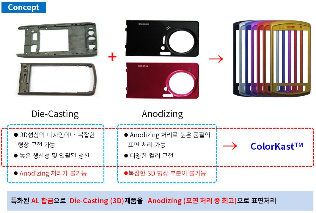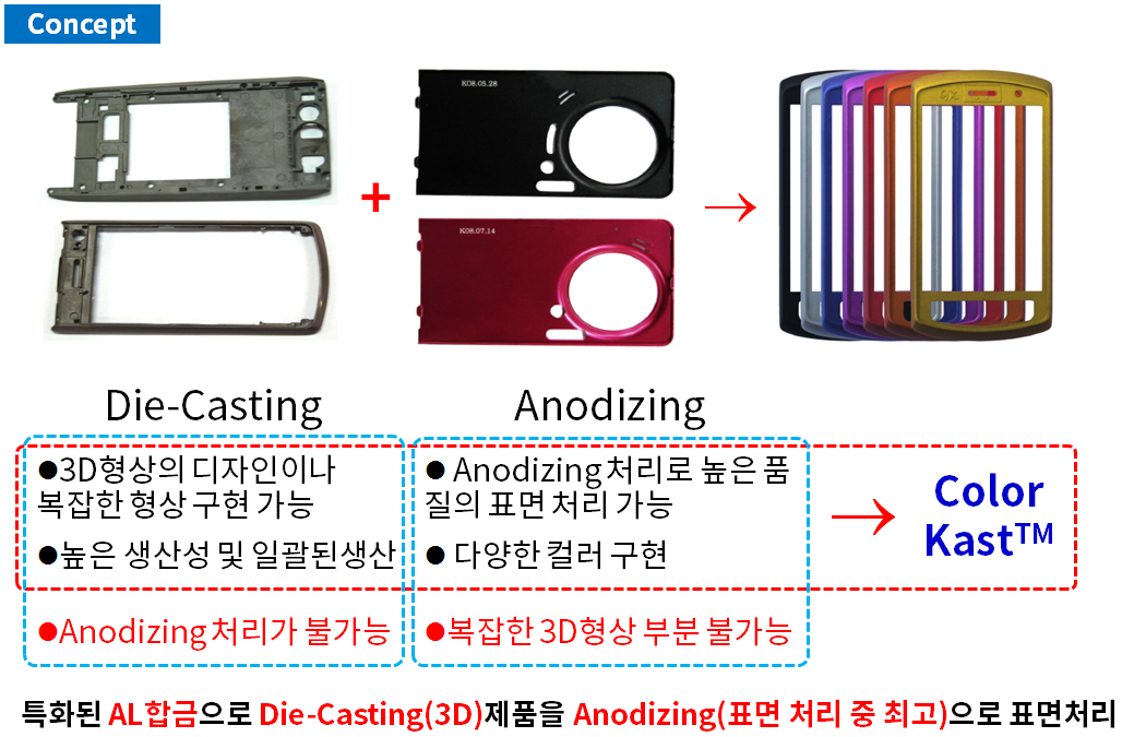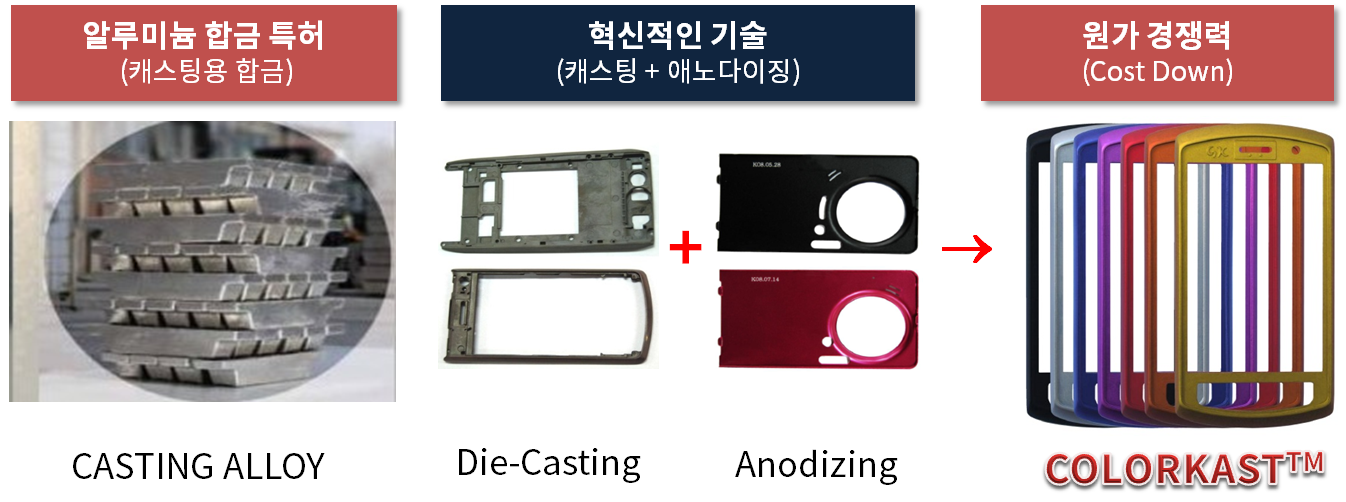 특히 칼라캐스트 적용을 통해 ‘다이캐스팅→아노다이징’ 2단계 공정 수요처의 비용과 시간을 절감할 수 있습니다. 예를 들어 다이캐스팅, 아노다이징 2단계 공정으로 나온 제품의 원가를 1000원, 시간은 1시간으로 가정 한다면 칼라캐스트 기술은 제품 크기나 용도에 따라 다르지만 원가와 시간을 최소 20%에서 최대 40%까지 줄일 수 있습니다.