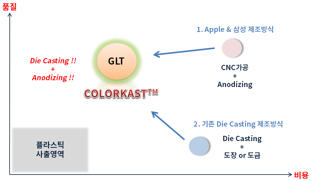 2016년 10월 설립된 (주)지엘텍은 세계 유일 원천기술 COLORCAST 특허를 보유한 기업입니다. 칼라캐스트는 다이캐스팅을 통한 아노다이징으로 컬러를 구현할 수 있는 기술로 “Die-Casting으로 3D 형상 구현하고 표면 품질을 Anodizing으로 마무리하는 원천 기술”입니다.