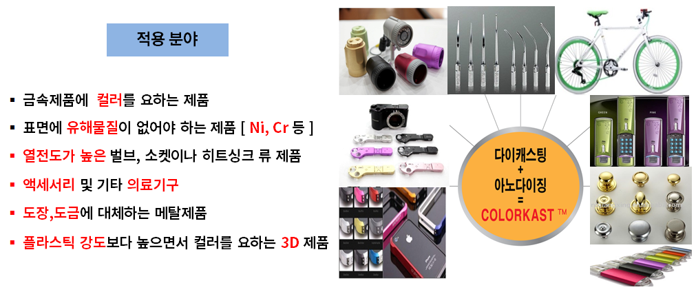 칼라캐스트의 적용 분야는 컬러를 요하는 모든 금속제품, 표면에 유해물질이 없어야 하는 제품(Ni, Cr 등), 열전도가 높은 벌브, 소켓이나 히트싱크류 제품, 악세사리 및 기타 의료기구, 도장 및 도금에 대체하는 메탈 제품, 플라스틱 강도보다 높으면서 컬러를 요하는 3D 제품 등으로 단순히 금속, 메탈 제품 같이 덩치 큰 제품 뿐만 아니라 컴퓨터, 가전, 스마트폰 등 플라스틱 제품에도 모두 적용됩니다.