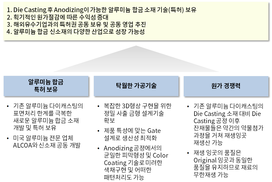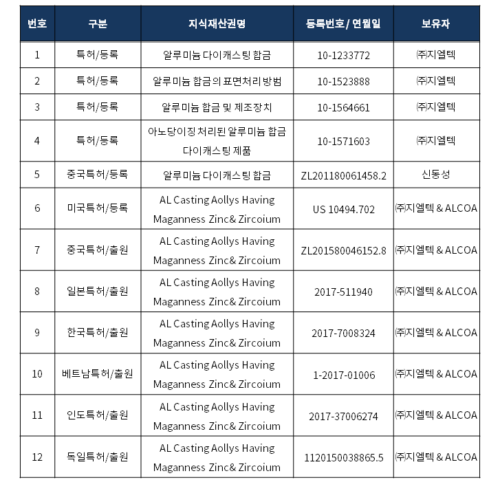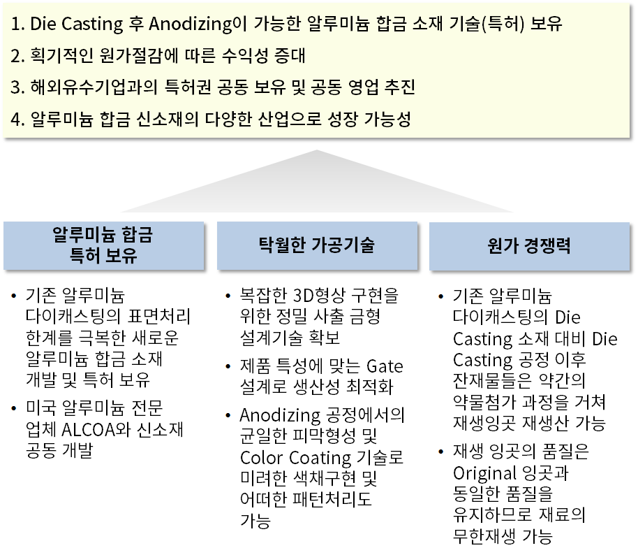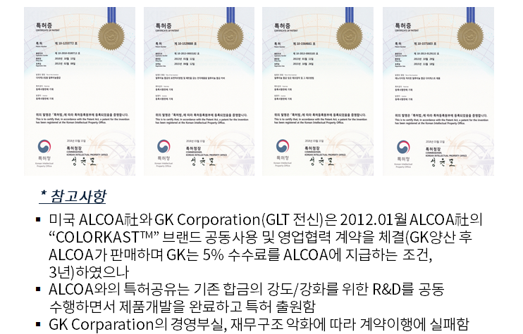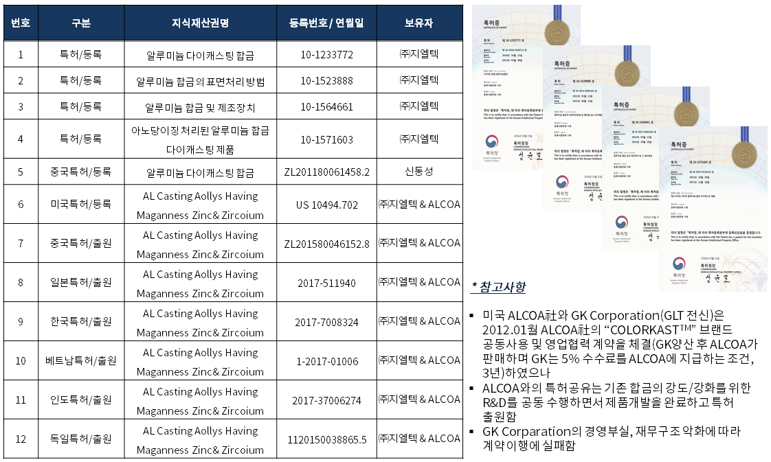 지엘텍이 보유한 특허기술은 1. 기존 Press forming 및 CNC 공정과 같은 대량의 CNC머신 설비 투자가 불필요해 ADC12 대비 재활용도를 크게 향상시켜 획기적으로 원가가 절감되며 2. 세계적인 알루미늄 기업인 ALCOA와 특허권 공동 보유로 향후 ALCOA의 대규모 영업망을 이용한 판매 확대 및 전략적 R&D를 지속적으로 추진할 수 있고, 3. 소재 경량화•고강도화, 외장재의 고급화, 3D 형상에 컬러 구현을 요구하는 자동차 산업, 건자재, 전기 및 전자산업, 스포츠산업 등 다양한 산업에 적용되어 성장 가능성이 매우 큽니다.