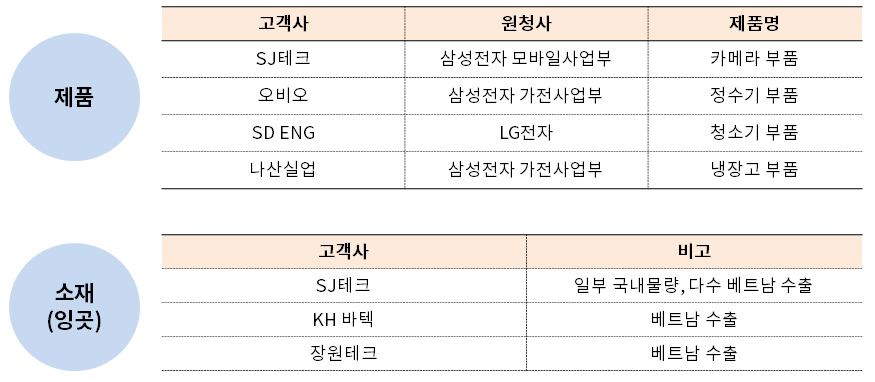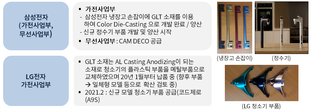 지엘텍의 칼라캐스트는 기술력과 시장성을 이미 인정받아 삼성전자 모바일사업부의 휴대폰 카메라 부품, 삼성전자 가전사업부의 정수기와 냉장고 부품, LG전자 청소기 부품 등에 제품을 납품하고 있고, 소재(잉곳) 또한 SJ테크/KH바텍/장원테크 등을 통해 국내 기업 납품 뿐만 아니라 베트남에도 수출되고 있습니다.