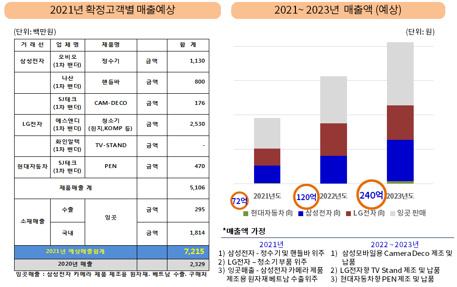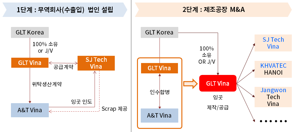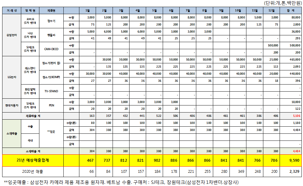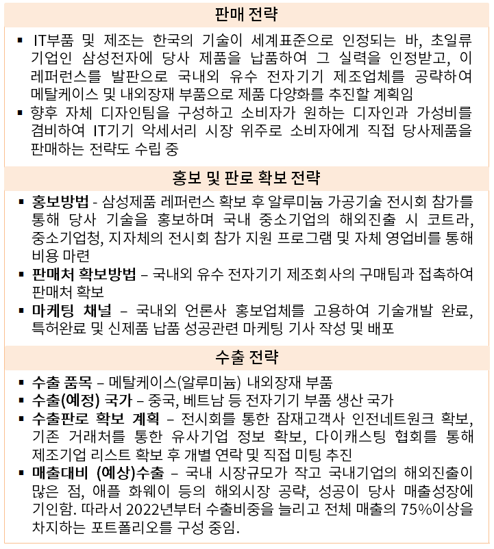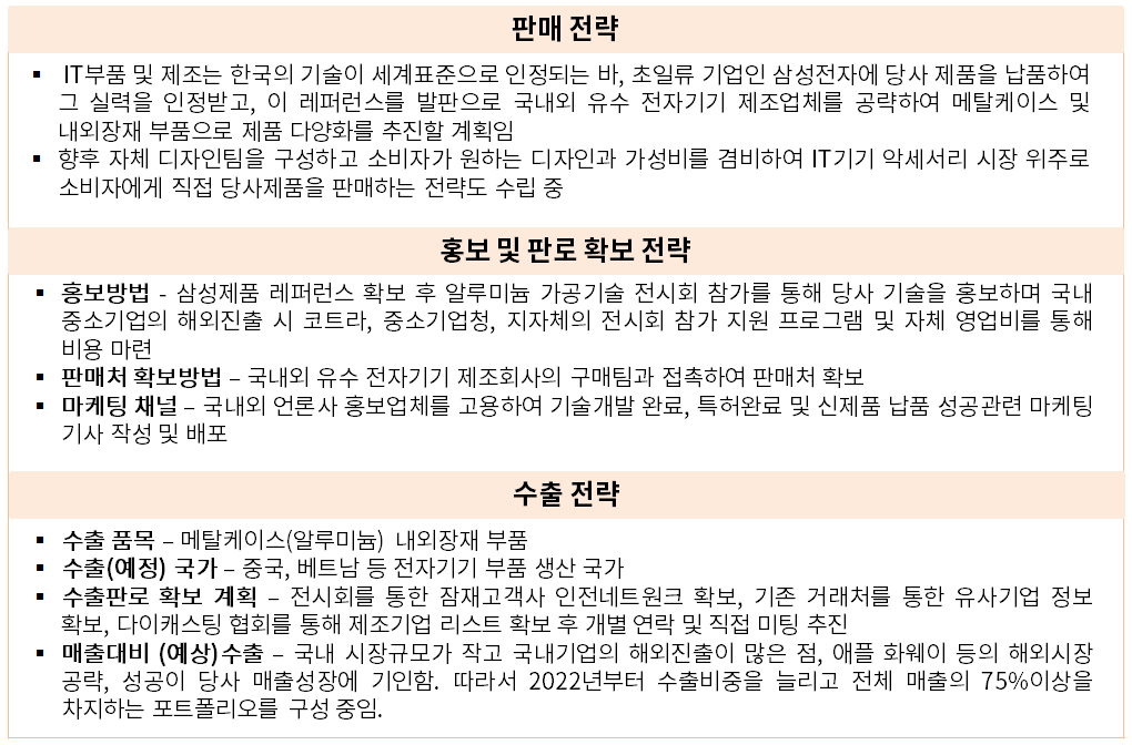 2021년도에는 베트남에서의 코로나 확산으로 지엘텍의 1차 벤더가 있는 공장지대 전체가 4개월간 폐쇄 그리고 반도체 수급 불균형으로 자동차 및 전자제품 생산이 축소되어 매출 감소에 영향을 주었고, 환율 상승에 따른 수입 원재료 가격(알루미늄 가격 약 70% 상승) 상승 등 국내•외적으로 어려운 상황이었음에도 불구하고 전년도 대비 매출이 3배 이상 성장하였습니다. 특히 2021년 6월 새 사옥 매입(공장부지 500평 규모, 27억 원)과 설비 및 시설투자(약 5억 원 규모)를 통해 대규모의 발주 수주가 가능하게 되었습니다. 이에 따라 올해는 작년보다 2배 이상의 성장을 예상하고 있습니다.