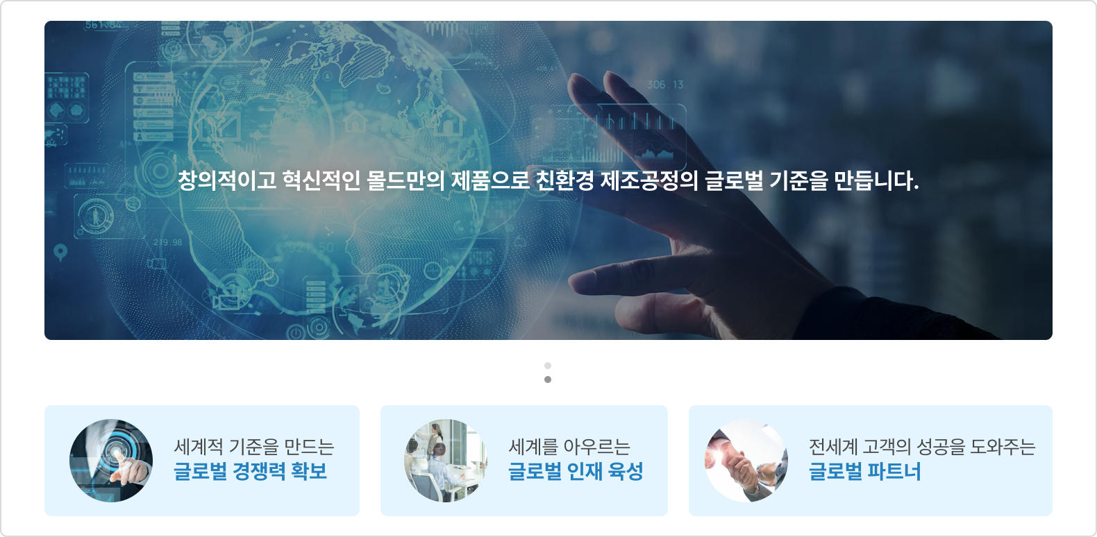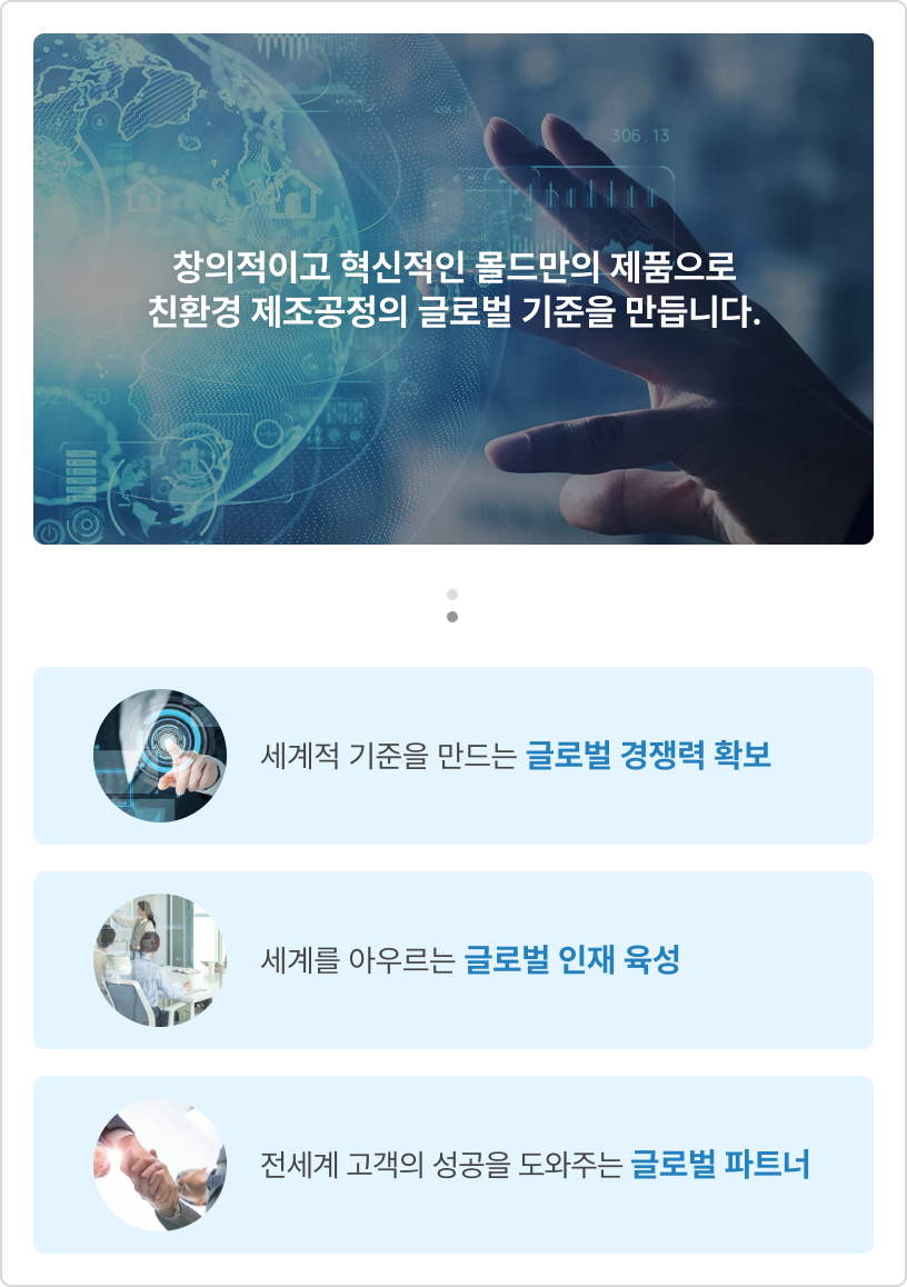 몰드는 글로벌 제조 현장에서 최고의, 최적의 로봇 기술을 바탕으로 미래 모빌리티 산업과 로봇 자동화 기술을 선도해 나갈 것입니다.