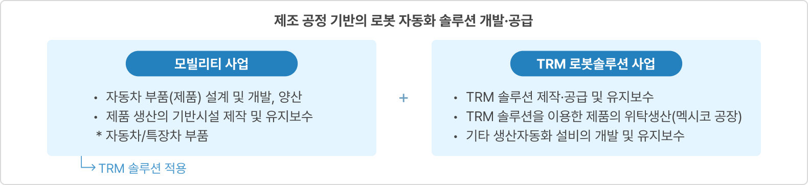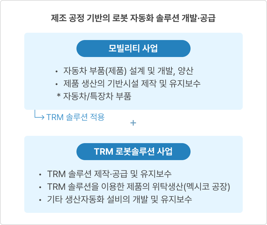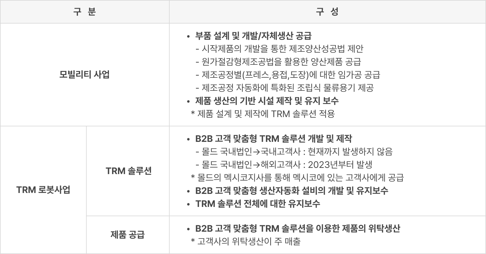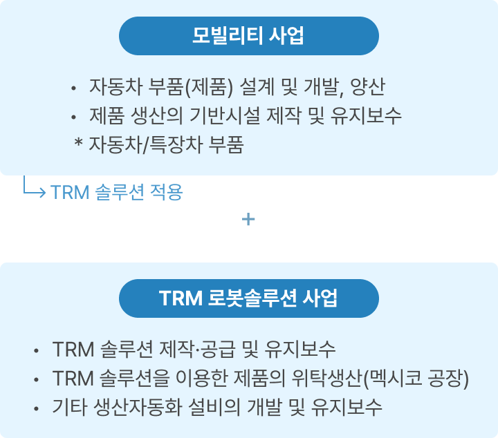 ❷ TRM 로봇사업은 TRM 솔루션 공급과 제품 공급으로 구성됩니다. TRM 솔루션 공급은 B2B 고객 맞춤형 TRM 솔루션 개발 및 제작, B2B 고객 맞춤형 생산자동화 설비의 개발 및 유지보수, TRM 솔루션 전체에 대한 유지보수로 이루어져 있으며, 2023년부터 몰드의 멕시코지사를 통해 멕시코에 있는 고객사들에게 솔루션을 공급하고 있습니다. 제품 공급은 B2B 고객 맞춤형 TRM 솔루션을 이용한 제품의 위탁생산으로 고객사의 위탁생산이 주요 매출입니다.