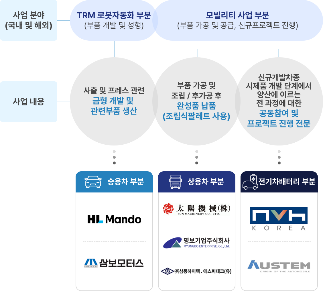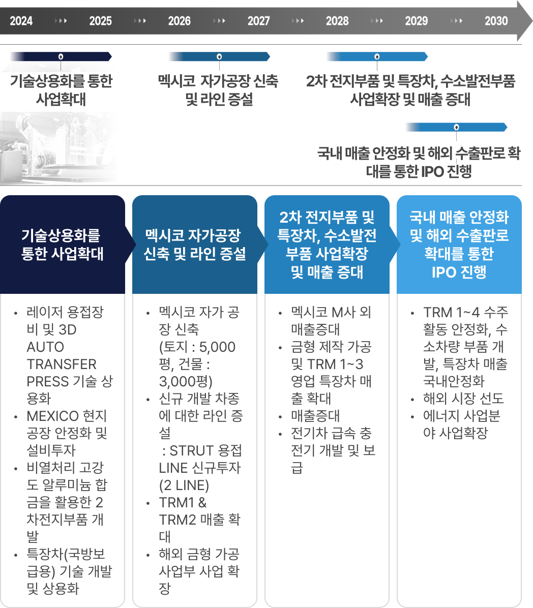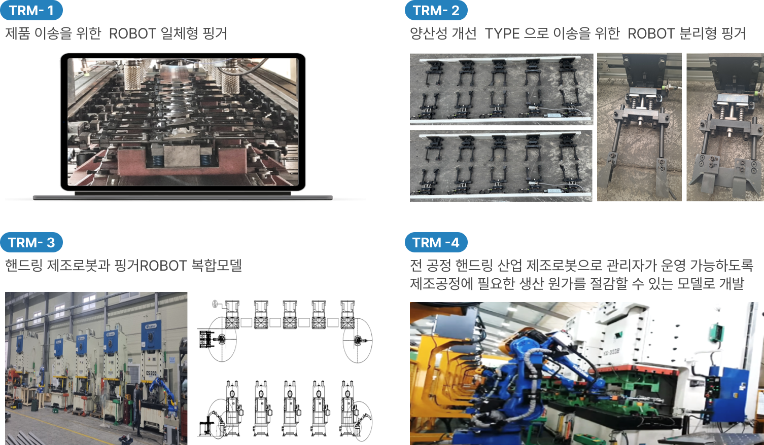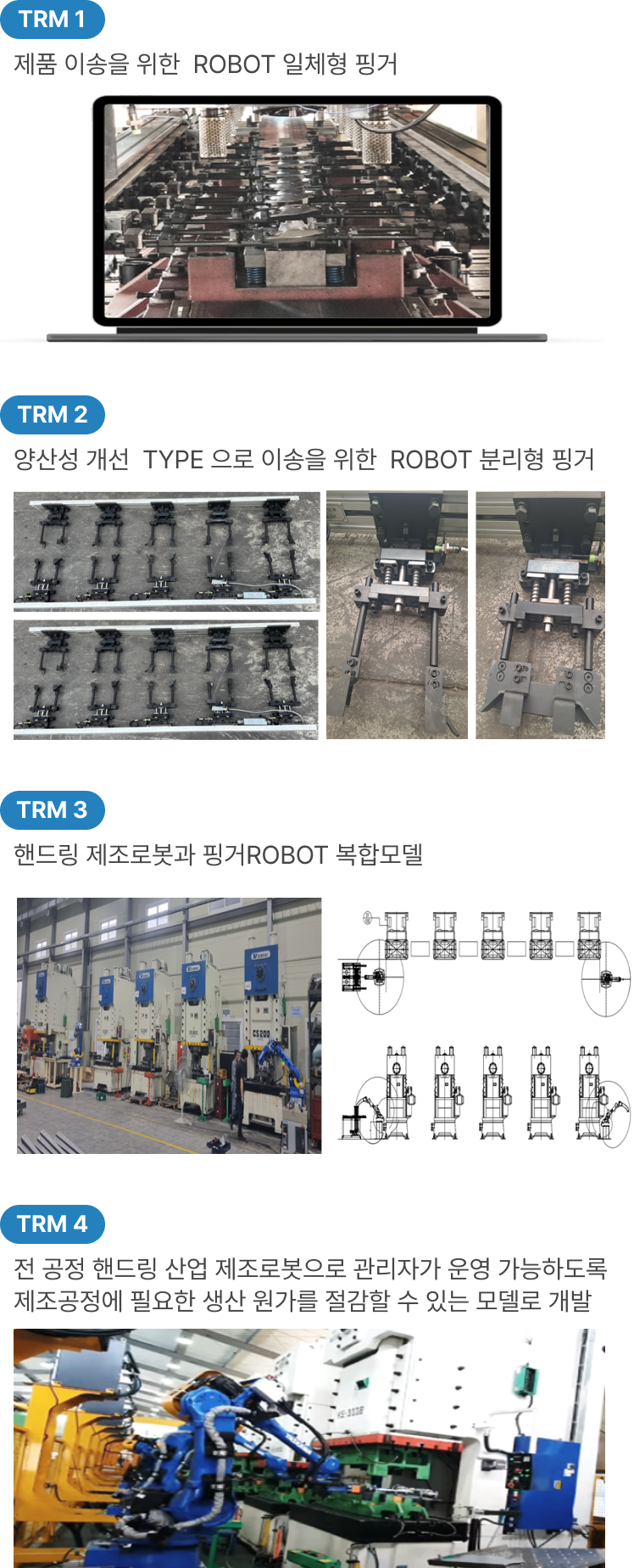 현 제조업 분야는 부품 전체 제조 공정 중 일부 공정만 처리하는 방식으로는 회사 성장에 많은 한계가 있기 때문에 제품의 기획부터 소재의 투입 및 완성까지 전 과정을 자동화하는 ❶ 제조 공정 기반의 로봇 자동화 솔루션(TRM1∼4)을 개발하고 있으며 ❷ 현재 TRM-1을 개발 완료하여 자재 가공 단계(자동으로 가공·이송·조립)에 적용하고 있음