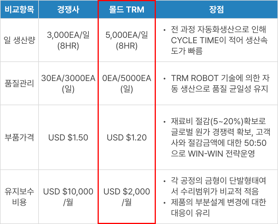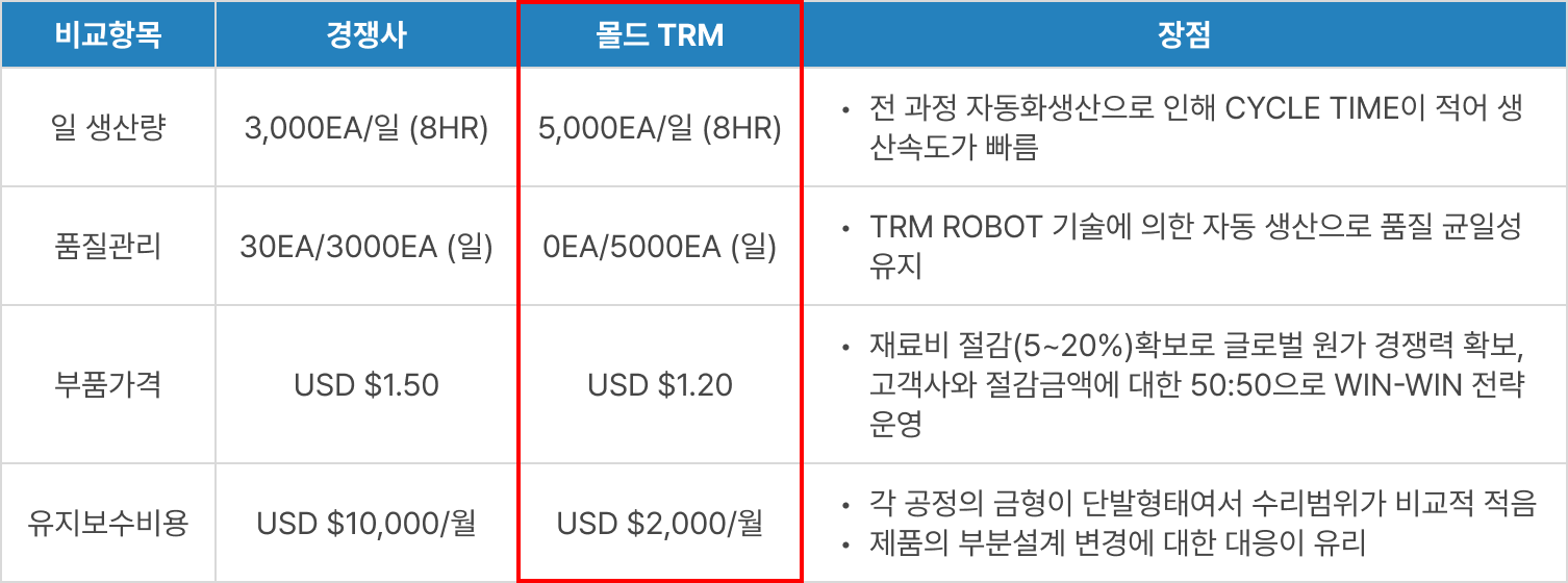 몰드의 모빌리티 사업 분야는 전기차 전환 가속에 따른 미래차 부품 시장 규모 확대, 엔진·변속기 등 자동차 부품의 경량화, 첨단기술의 발전으로 더욱 확대될 것이며, 또한 경쟁력 강화를 위한 제조 분야의 로봇 솔루션의 수요도 늘어날 것으로 예상됨에 따라 TRM 솔루션의 성장이 기대되고 있습니다.