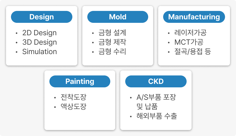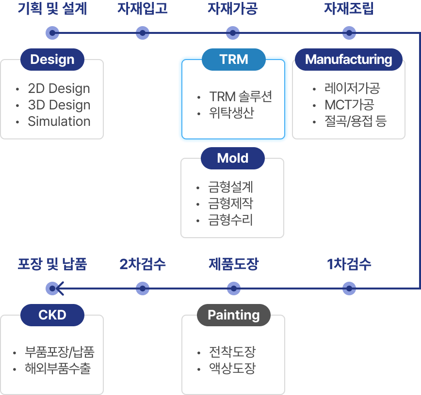 몰드의 TRM 솔루션은 부품 개발의 기획부터 완성품 납품까지 전 제조 과정을 자동화하는 생산방식 구현을 목표로 합니다.
