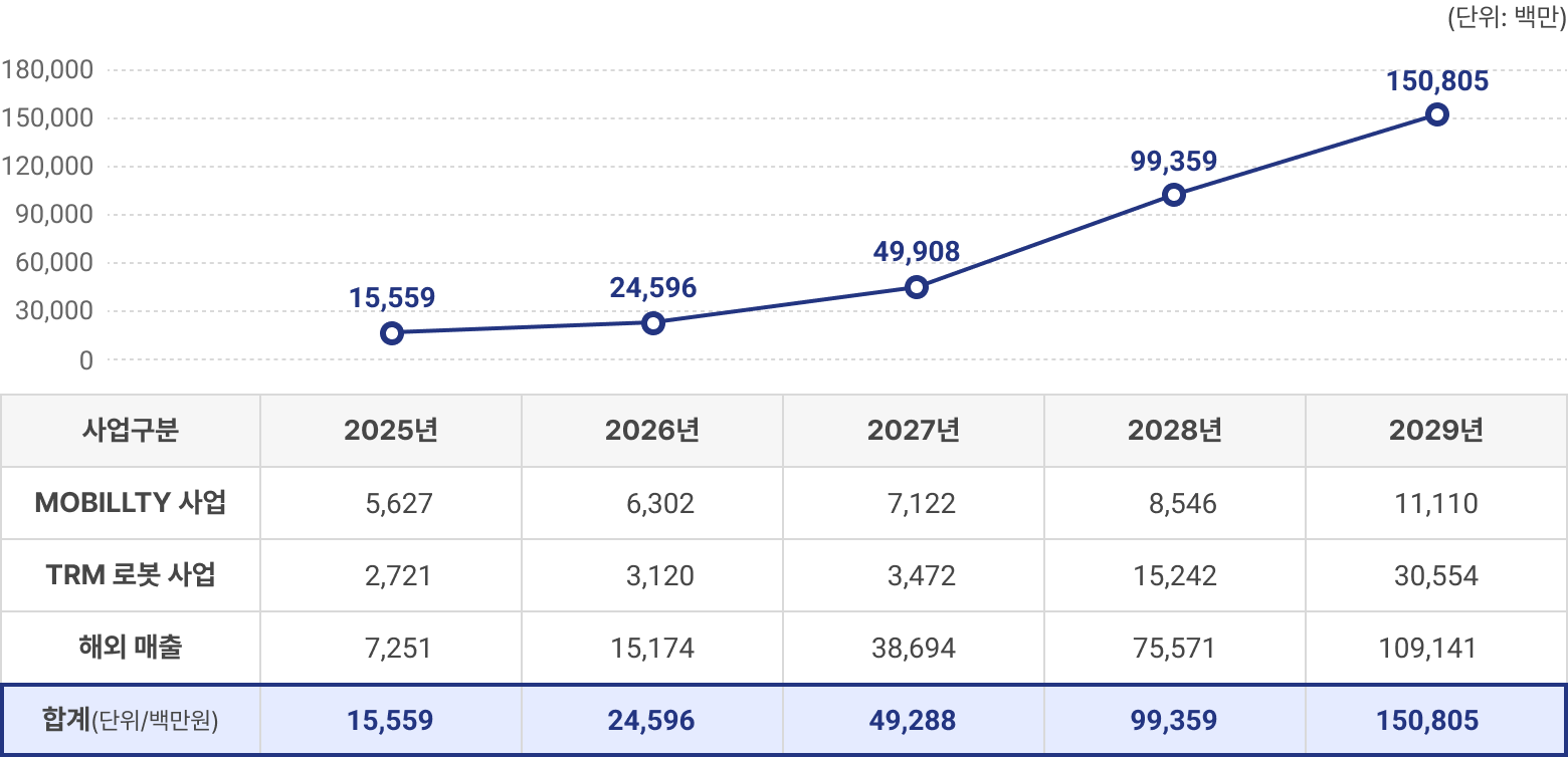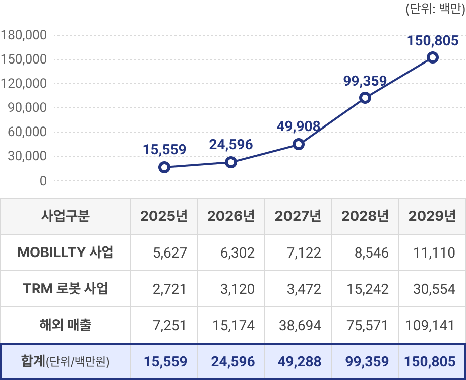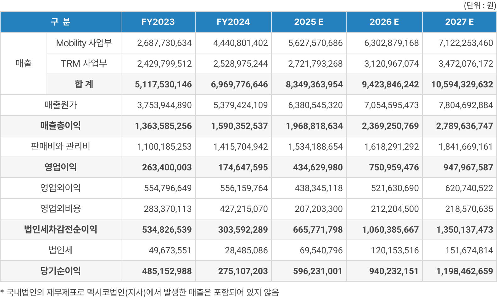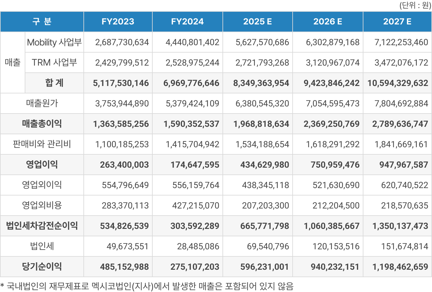 국내 모빌리티 및 TRM 솔루션 사업의 성장과 함께 멕시코 법인의 매출이 급격하게 늘어날 것으로 예상됨에 따라 2026년 245억, 2027년 492억, 2028년 993억 2029년 1,508억의 매출달성을 기대하고 있습니다.