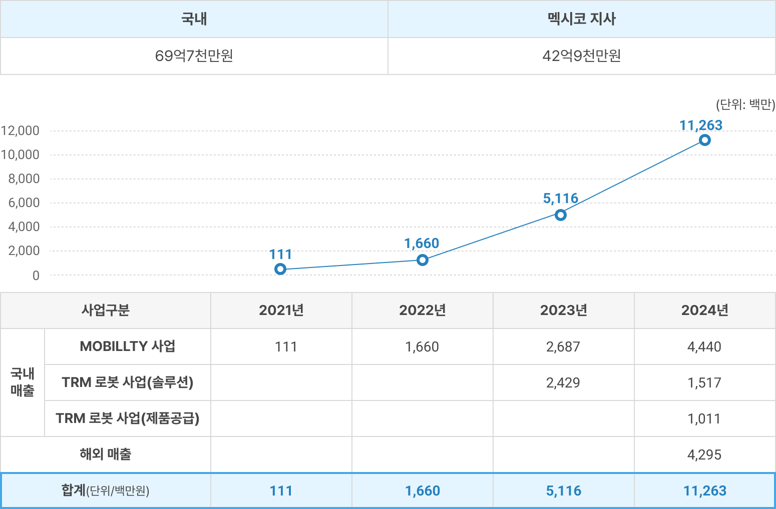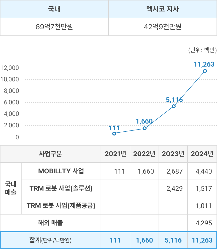 몰드 설립 첫해인 2021년부터 모빌리티 사업에서 매출(111백만원)이 시작되었으며, 2022년 1,660백만원에 이어 TRM 솔루션 공급 매출이 시작된 2023년에는 5,116백만원으로 매출이 급격하게 증가하였습니다. 2024년부터 본격적으로 TRM 솔루션을 활용한 제품 생산·공급 매출이 발생하면서 11,263백만원의 매출 성과를 얻었으며 특히, 멕시코 법인(지사)에서의 TRM 솔루션을 활용한 제품 생산이 시작되면서 해외매출이 본격적으로 발생하기 시작하였습니다(국내 매출은 69억7천만원, 멕시코 법인의 해외매출은 42억9천만원). 2025년 9월 기준 매출은 총 120억원 정도로 집계되었으며, 연말까지 약 155억 정도를 달성할 것으로 예상하고 있습니다.