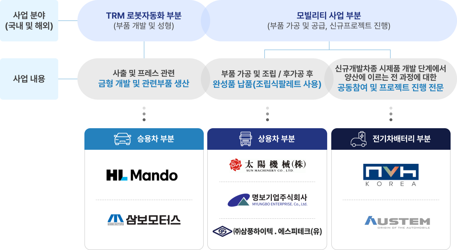 ❶ 모빌리티 사업은 자동차 부품 설계 및 개발/공급, 제품 생산의 기반 시설 제작 및 유지 매출로 구성되어 있습니다.