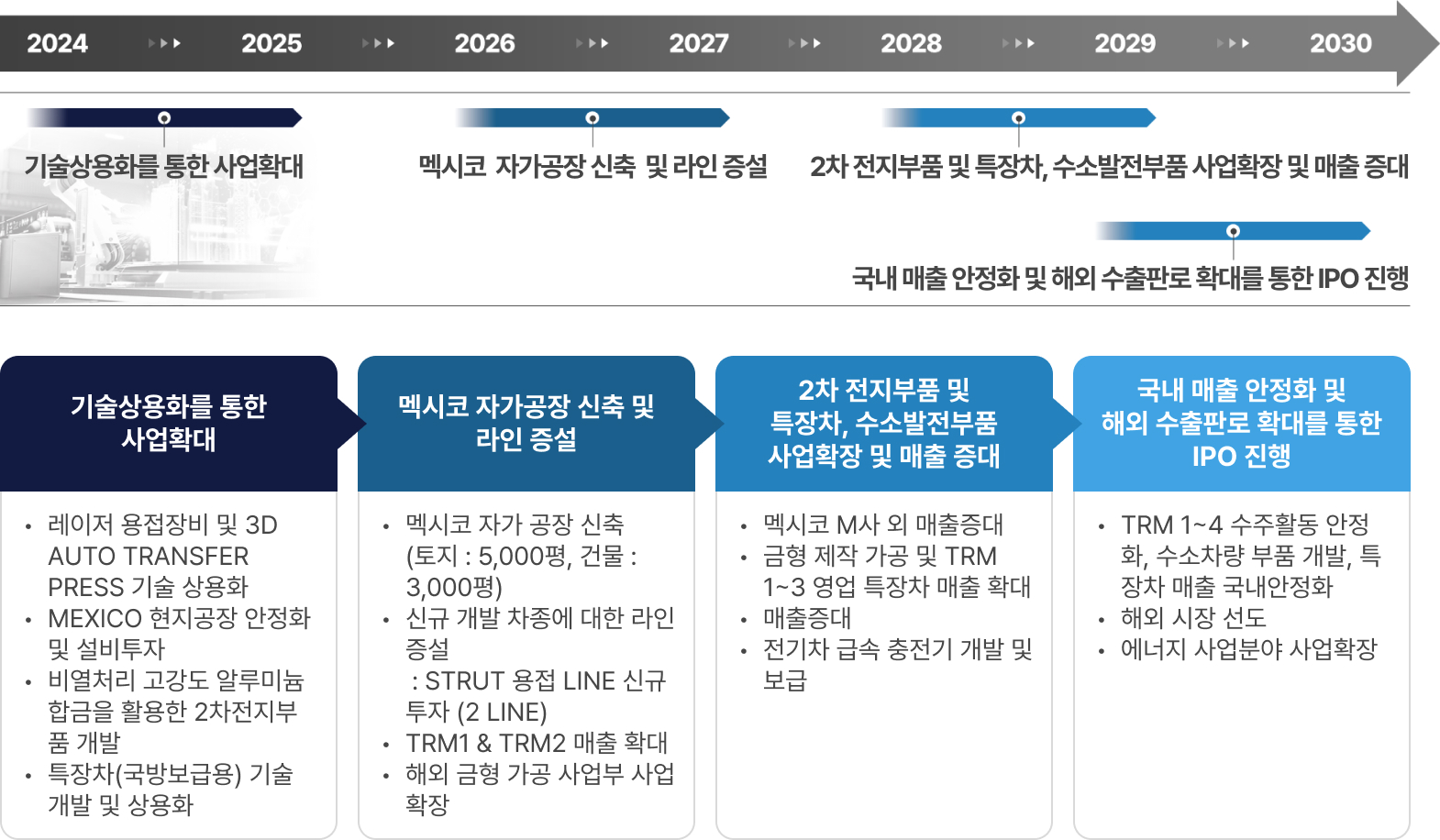 몰드는 국내 본사 및 멕시코 법인을 통해 자동차 부품을 개발·공급하는 모빌리티 사업 분야에서 신 ROBOT 제조 공법의 TRM 솔루션(TRM-1)을 적용하여 균일한 고품질의 제품을 독점 양산하고 있으며, 신규 차종에 대한 부품 수주를 계속 확보해나가고 있습니다.