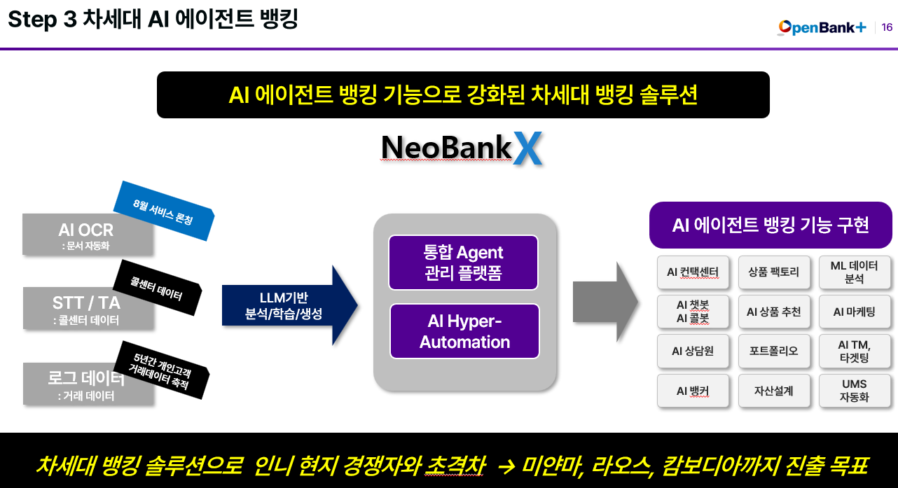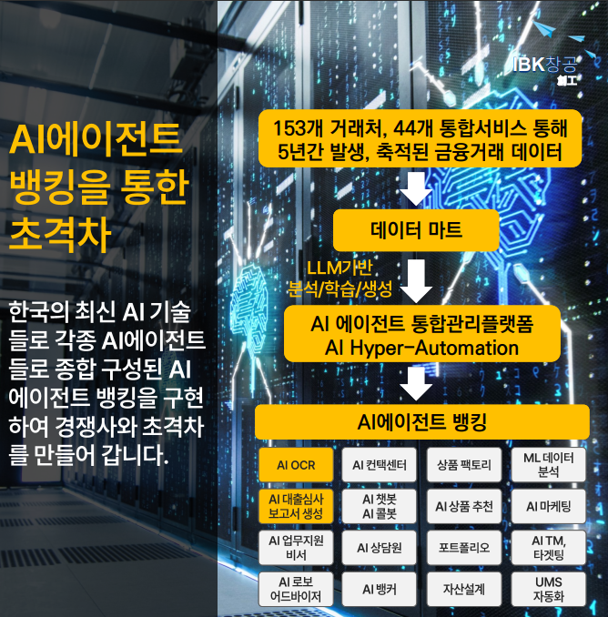 AI 에이전트 뱅킹으로 타 경쟁사들과 초격차를 만들려고 노력하고 있습니다. 최근 새로 영입하신 박주원 대표님이 생성형 AI 공학박사시고, 은행에서 디지털뱅킹 업무 경험이 많으셔서 새로운 방향으로 뱅킹 서비스를 만들어 가고 있습니다.