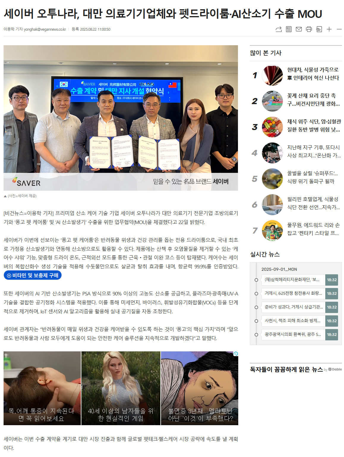 두 번째로, 세이버 프리미엄 산소 케어 브랜드 오투나라가 대만 의료기기 전문 기업 조방의료기기사에 퐁고 펫 케어룸, AI산소발생기 수출 MOU를 체결하며, 글로벌 펫헬스케어 시장 진출에 본격 시동을 걸었다는 소식입니다.