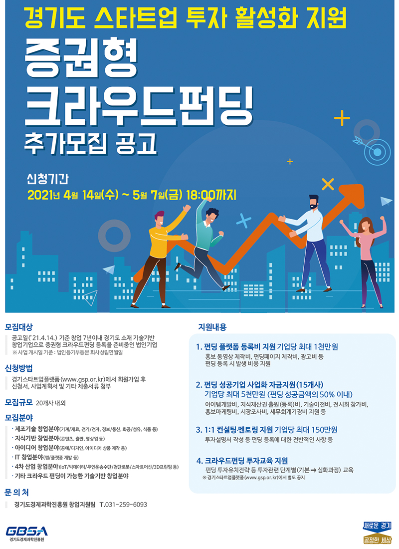 경기도경제과학진흥원에서 경기도 스타트업 투자 활성화를 위해 증권형 크라우드펀딩 신청 기업을 추가 모집하고 있습니다. 저희 펀딩포유도 본 사업의 온라인 소액투자 중개업자로 참여하고 있으니 많은 신청 바랍니다.