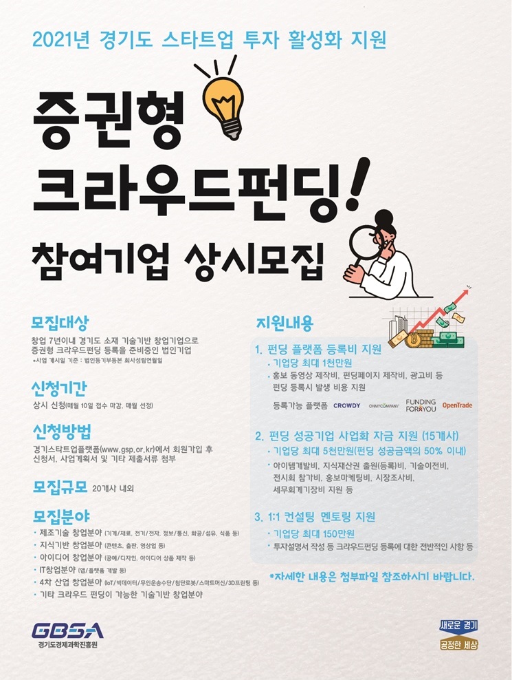 경기도경제과학진흥원에서 경기도 스타트업 투자 활성화를 위해 증권형 크라우드펀딩 신청 기업을 추가 모집하고 있습니다. 저희 펀딩포유도 본 사업의 온라인 소액투자 중개업자로 참여하고 있으니 많은 신청 바랍니다.
