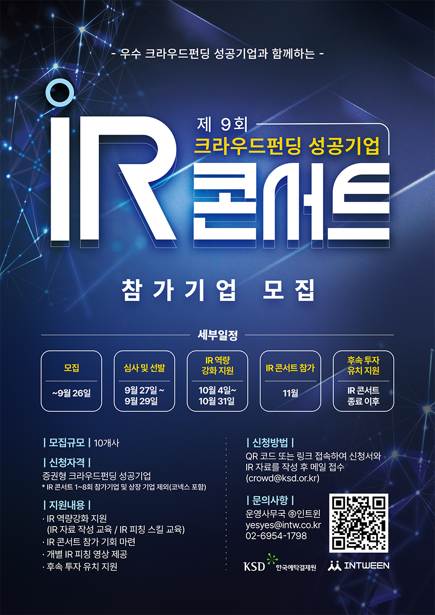 한국예탁결제원에서 제9회 크라우드펀딩 성공기업 IR콘서트를 개최합니다. 펀딩포유에서 증권형 크라우드펀딩을 성공한 기업은 모두 신청할 수 있으니, 많은 참여 바랍니다.