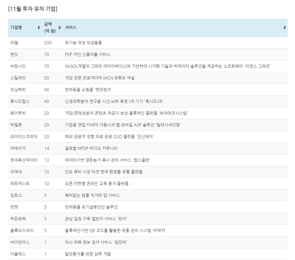 투자 이야기[스타트업 투자 동향] 11월 투자 유치 29개 기업, 599억 원 규모… 라엘 200억 투자 유치 외