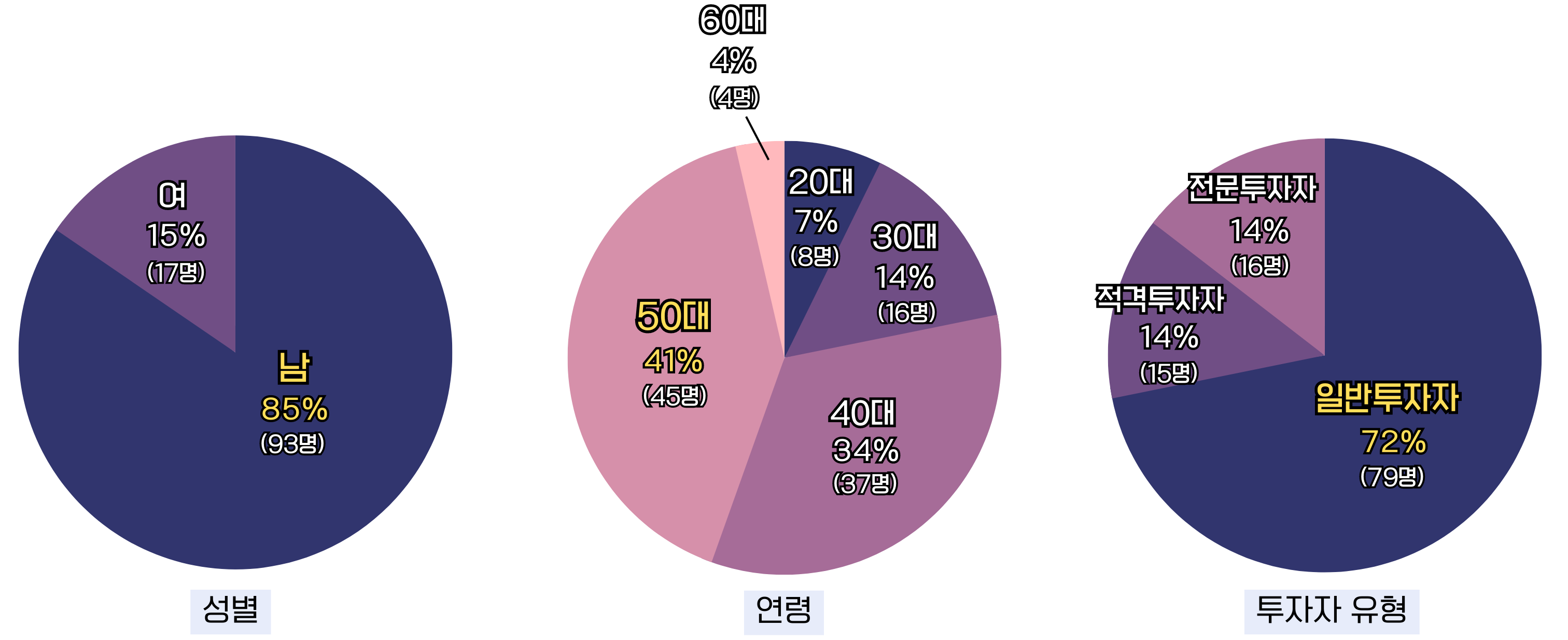 프라터 3차 프로젝트에는 총 110명이 참여하였으며 이 중 남성 85%(93명), 여성 15%(17명)으로 남성 참여자의 비율이 압도적으로 높았습니다. 연령대별로는 40~50대가 전체의 75%(82명)를 차지하였고 이 중 50대의 참여율이 41%(45명)로 가장 높았습니다. 전체 투자자수가 확대된 만큼 20-30대의 참여율도 타 프로젝트에 비해 높은 편입니다. 또한 투자자 유형별로는 일반투자자가 72%(79명), 전문투자자 14%(16명), 적격투자자 14%(15명) 순으로 나타났습니다. 주목할 부분은 일반투자자가 1개 기업에 투자할 수 있는 ‘투자한도 500만원’에 최대 근접한 금액을 투자한 일반투자자가 20%를 차지하였다는 점입니다. 기업의 상장 등 EXIT 실현 시 예상되는 수익에 대한 기대감이 작용한 것으로 풀이됩니다.