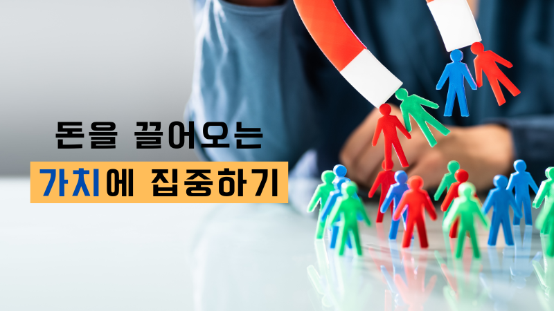 그렇다면 어떻게 해야 돈을 쫓지 않고 돈이 따라오게 할 수 있는 걸까요? 바로 가치를 만드는 것입니다. 가치란 사람들이 가지고 있는 문제를 해결하거나 욕구를 해소 시켜주는 데에 있어 그것을 하기 위해 사람들이 돈을 지불할 수 있는 정도의 것을 이야기합니다. 사람들이 돈을 지불할 수 있을 정도의 무언가를 만들어낸다면 돈을 벌 수 있는 가치가 생기는 것이지요. 이를 부가가치라고 합니다. 즉 중요한 것은 내가 돈을 쫓는 것이 아니라 가치를 만들어 돈이 따라오도록 만들어야 한다는 것입니다.