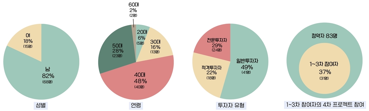 에브라임인터내셔널 프로젝트에는 총 83명이 참여하였습니다. 이 중 남성은 68명(82%), 여성은 15명(18%)이었으며, 연령대별로는 40~50대가 전체의 76%(63명)를 차지하였고 이 중 40대가 가장 많았습니다(40명). 투자자 유형 구성은 일반투자자 49%(41명), 전문투자자 29%(24명), 적격투자자 22%(18명)입니다.