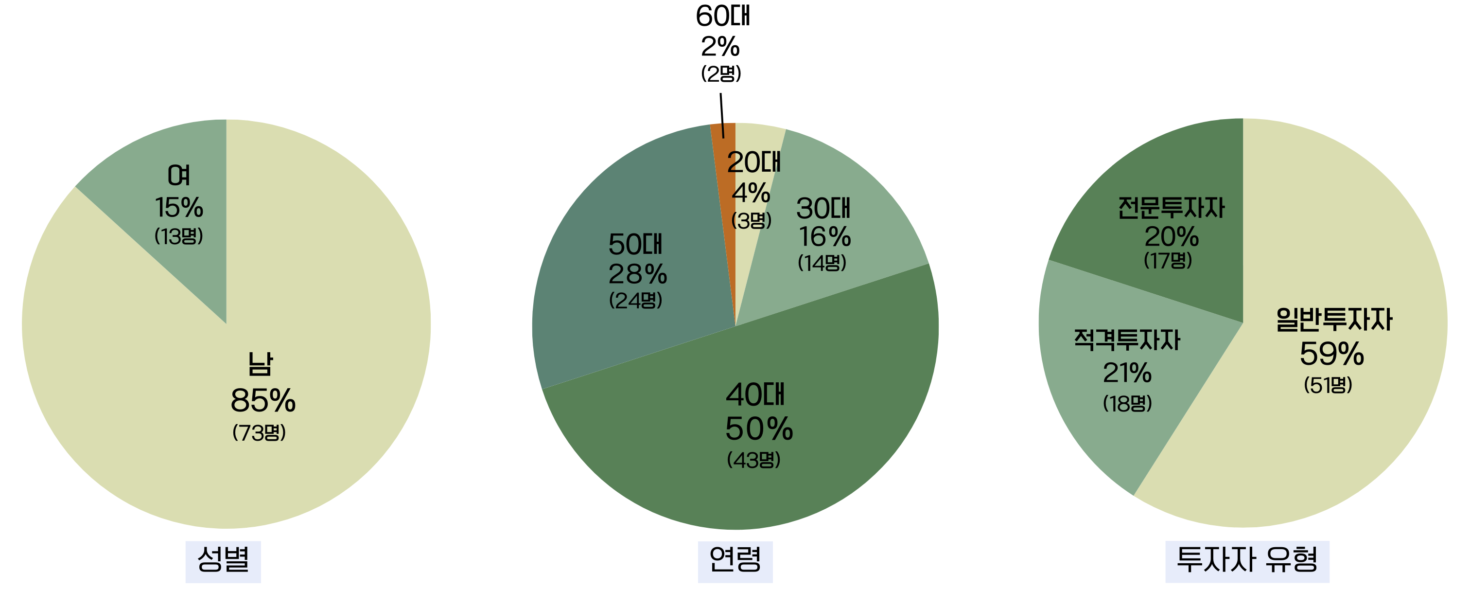 성하 프로젝트에는 총 86명이 참여하였습니다. 이 중 남성이 85%(73명), 여성이 15%(13명)으로 남성의 참여 비율이 높았고, 연령대별로는 40~50대가 전체의 78%(67명)를 차지하였는데요. 특히 40대가 전체 참여자의 절반(43명)을 차지하는 것으로 나타났습니다. 투자자 유형별로는 일반투자자 59%(51명), 적격투자자 21%(18명), 전문투자자 20%(17명) 순 이었습니다.