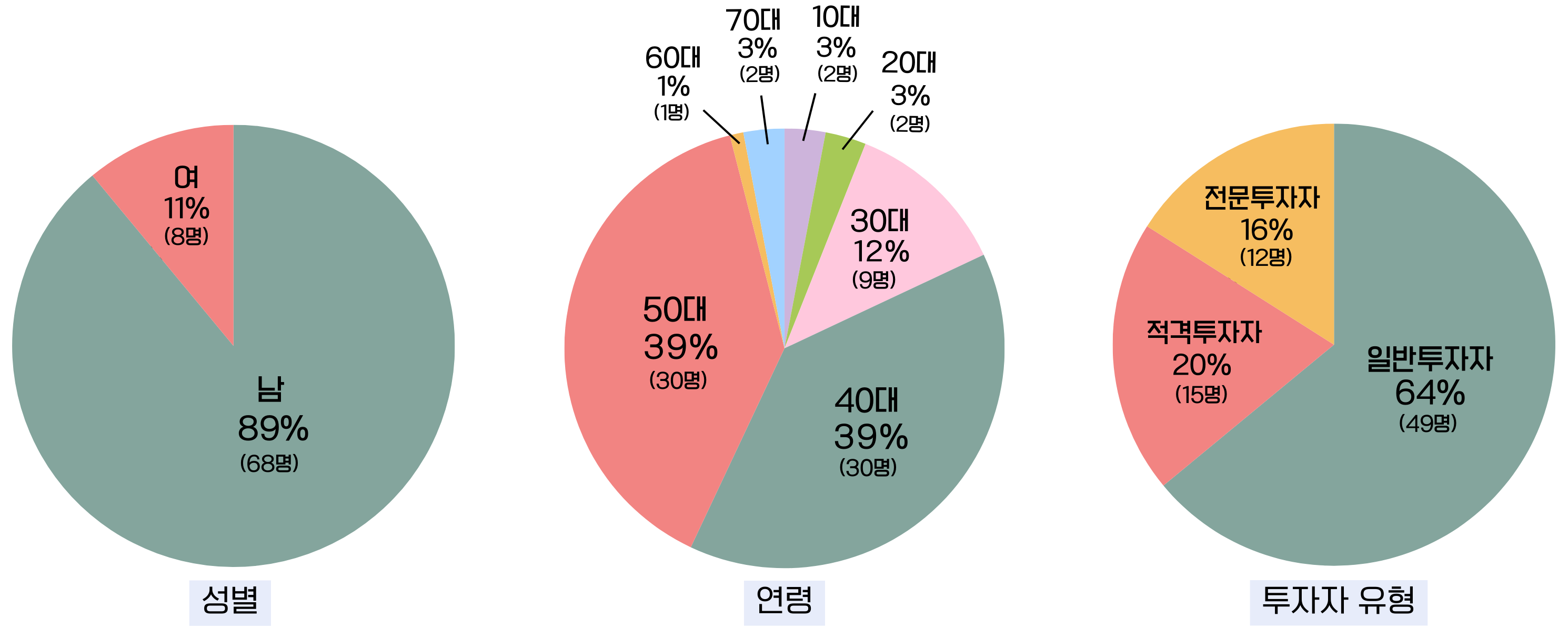 티움앤코 프로젝트에는 총 76명이 참여하였습니다. 이 중 남성이 68명(89%), 여성이 8명(11%)으로 남성의 참여 비율이 높았고, 연령대별로는 40~50대가 전체의 78%(60명)를 차지하였는데요. 40대, 50대가 동일하게 전체 참여자의 절반(각 30명)을 차지하는 것으로 나타났습니다. 투자자 유형별로는 일반투자자 64%(49명), 적격투자자 20%(15명), 전문투자자 16%(12명) 순이었습니다.