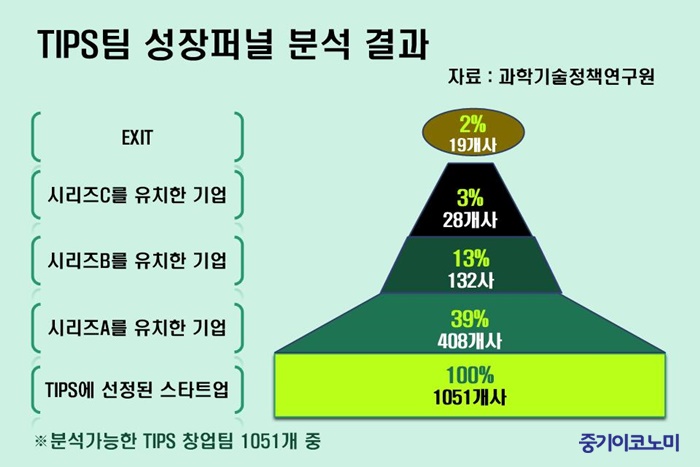 위 자료는 과학기술정책연구원 보고서에 나온 통계입니다. TIPS(*R&D 자금을 지원 받을 수 있는 정책. 선정 시 기술적으로 검증된 기업이라고 할 수 있음)에 선정된 스타트업 기업을 100%로 봤을 때, TIPS에 선정된 기업 중에서 시리즈A 투자를 받은 기업은 39%입니다. 시리즈A 투자를 유치한 기업 중에서 시리즈B투자를 유치한 기업은 13%입니다. 시리즈A 투자를 받은 기업 중에서 30% 정도가 시리즈 B투자를 받게 된 것입니다. 그리고 시리즈C 투자까지 유치한 기업은 3%에 불과합니다. 시리즈B 투자를 받은 것에 비하면 30%정도 뿐이지요. 엑싯에 성공한 기업은 겨우 2% 뿐입니다.