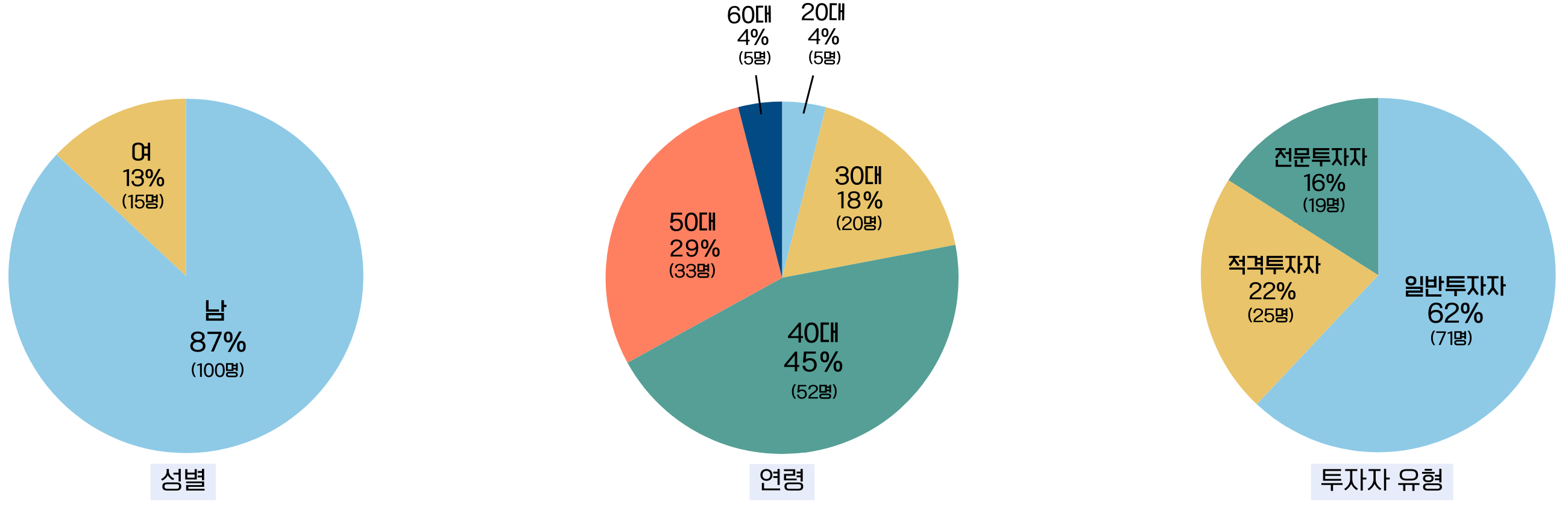 에스엔엘코리아 프로젝트에는 총 115명이 참여하였습니다. 이 중 남성이 87%(100명), 여성이 13%(15명)으로 남성 참여자가 더 많았고 연령대별로는 40~50대가 전체의 74%(85명)를 차지하였습니다. 투자자 유형별로는 일반투자자 62%(71명), 적격투자자 22%(25명), 전문투자자 16%(19명) 순 이었습니다.