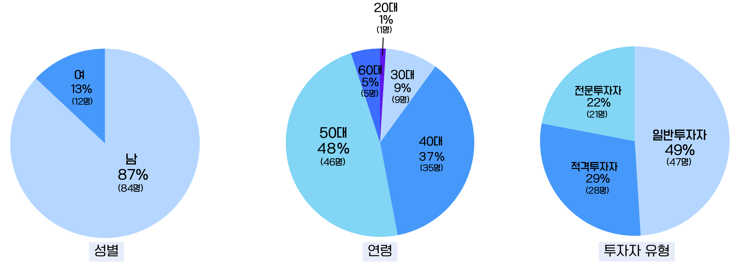 씨라이프사이언스랩 프로젝트는 기간 연장 없이 1회 증액을 거쳐 최종 211,147,200원(목표 금액의 105.5%)을 모집하였습니다. 프로젝트 참여자 총 96명 중 남성은 84명(87%), 여성은 12명(13%)으로 나타났으며, 40~50대 연령층이 전체의 85%(81명)를 차지하였습니다. 투자자 유형별로는 일반투자자가 49%(47명)로 가장 많았고, 적격투자자 29%(28명), 전문투자자 22%(21명) 순이었습니다.