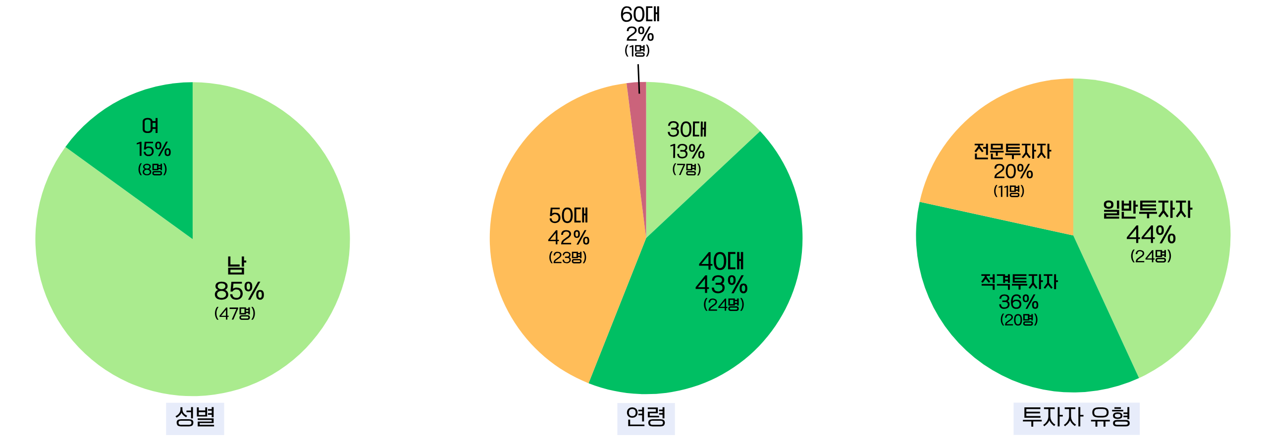 셈스게임즈 프로젝트는 기간 연장 없이 1회 증액을 거쳐 최종 107,700,000원(목표 금액의 89.8%)을 모집하였습니다. 프로젝트 참여자 총 55명 중 남성은 47명(85%), 여성은 8명(15%)으로 나타났으며, 40~50대 연령층이 전체의 85%(47명)를 차지하였습니다. 투자자 유형별로는 일반투자자가 44%(24명)로 가장 많았고, 적격투자자 36%(02명), 전문투자자 20%(11명) 순이었습니다.