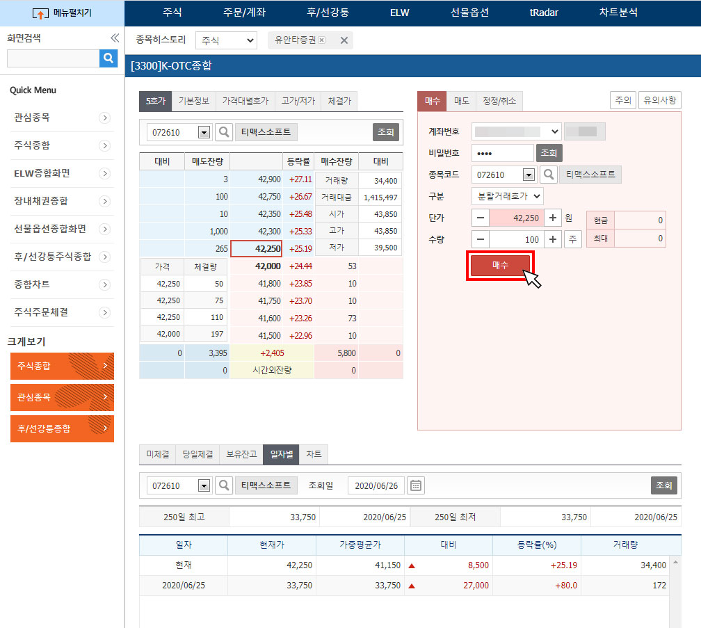 - 원하시는 만큼 매수수량과 매수단가를 입력하시고, ‘매수’버튼을 클릭하시면 됩니다.
