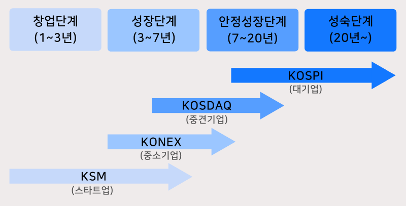 다만 창업부터 코스닥 상장까지 많은 기간이 소요되어 벤처투자가 활성화 되지 않는 점을 고려하여 한국거래소에서는 스타트업부터 대기업까지 기업의 성장 단계별로 주식이 거래될 수 있도록 다양한 형태의 주식시장을 운영하고 있습니다. 물론 각각의 상장 기준은 다르지만 이 과정을 통해 기업은 원활한 주식거래가 이루어질 수 있도록 하여 투자를 활성화할 수 있게 됩니다.