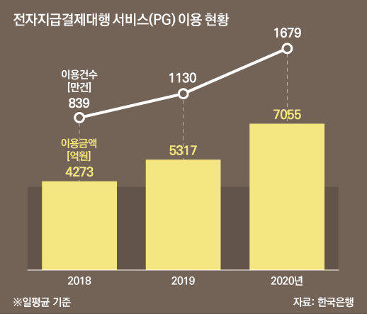 작년 금융감독원에 따르면 2020년 VAN사 영업실적을 전년도인 2019년과 비교해 봤을 때 84억 원이나 줄어들었다고 합니다. 이에 비해 PG 서비스의 이용실적은 해마다 증가하여 2020년도에는 전년대비 48.5%나 증가했다고 합니다.