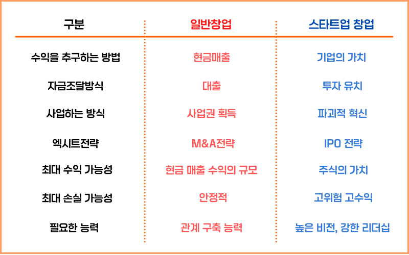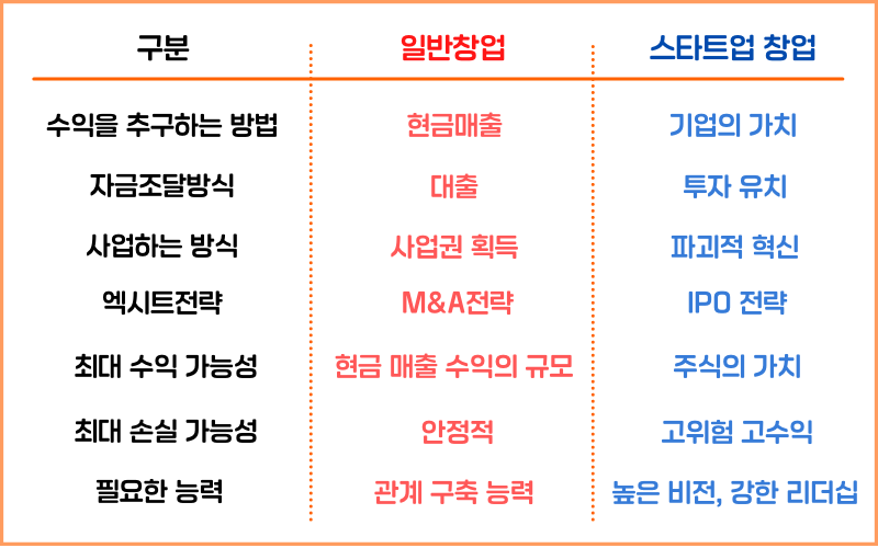 일반 창업은 반복되는 방식을 통해 지속적인 매출을 일으키고, 사업을 확장시킬 수 있는 아이템으로 사업을 진행합니다.