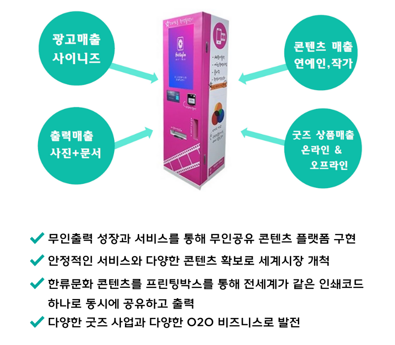 또한 무인숍과 숍인숍이라는 콜라보 비즈니스로 가맹점주들에게는 투잡과 일자리 제공을, 국민들에게는 보다 편리한 무인 출력서비스 문화를 만들어갈 것이며, 대형 마트들 뿐만 아니라 다양한 카테고리 기업들과 연계하여 공동으로 사용 가능한 통합 포인트 시스템과 공동 광고시스템을 통해 진정한 콘텐츠 공유 융합 비즈니스를 추구해 나갈 계획입니다.