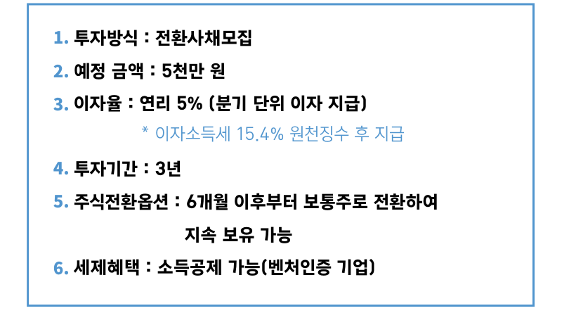 전환사채는 만기에 원금을 상환 받을 수 있는 상환권과 투자 후 6개월 이후부터 주식으로 전환할 수 있는 보통주 전환권을 가진 하이브리드형 투자상품으로 원금 상환의 안정성과 주식 전환의 수익성을 동시에 추구할 수 있어 투자자에게 매우 유리한 투자방식입니다.