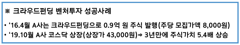 우리나라는 2016년 1월 크라우드펀딩제도 도입을 통해 정책자금 및 소수의 전문투자자(벤처캐피탈, 엔젤투자자) 등에 의존했던 벤처투자를 일반 대중이 온라인 플랫폼을 통해 쉽게 유망 초기 기업에 투자할 수 있도록 제도화 하였습니다. 제도 도입 이후 4년간 585개 기업이 1,128억 원을 조달하는 등 창업·벤처기업의 유의미한 직접 자금 모집수단으로 자리매김하고 있습니다.