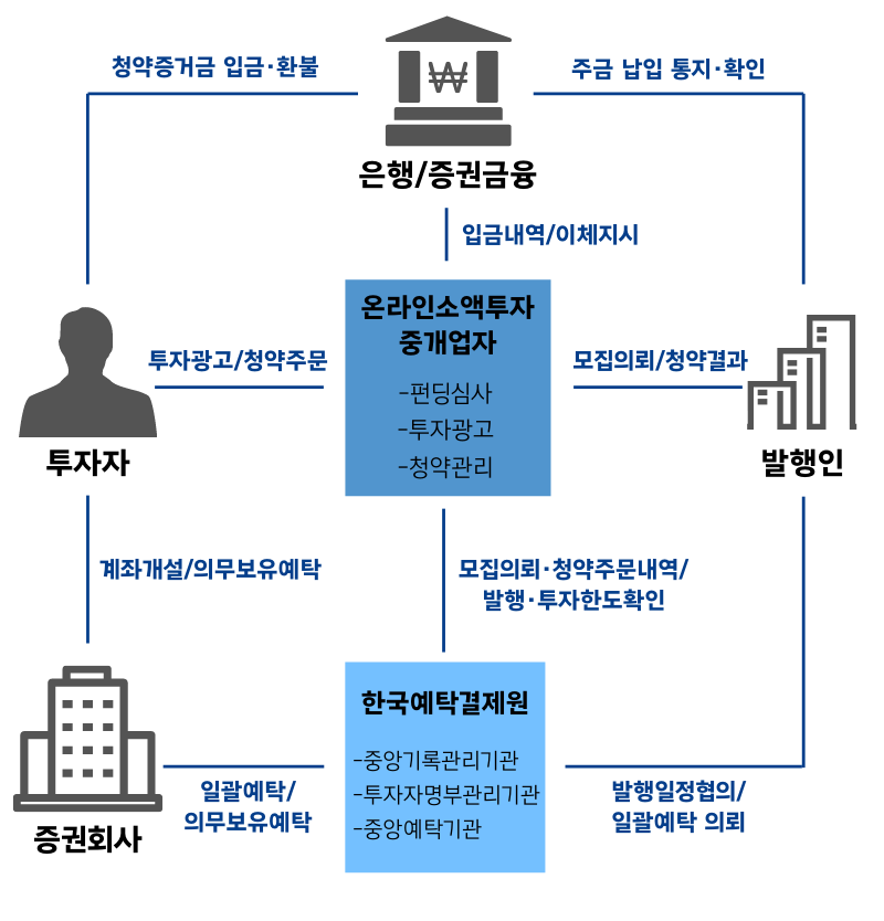 증권형 크라우드펀딩 중개업자는 「자본시장과금융투자에관한법률」제5장 온라인소액투자중개업자 등에 대한 특례에 따라 반드시 중개업자 외에 청약증거금 관리기관(한국증권금융)과 중앙기록관리기관(한국예탁결제원)을 갖춘 후 금융위원회에 등록하여야 합니다.