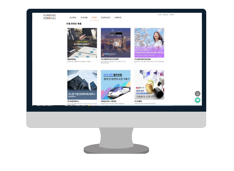 펀딩포유는 크라우드펀딩에 참여한 주주가 수시로 투자기업의 사업 진척 사항을 보고 받을 수 있도록 주주방을 개설해 드리고 있습니다(현재 9개 주주방 개설).