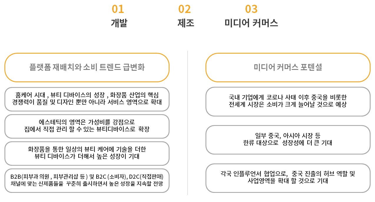 홈케어 시대인 요즘에는 뷰티디바이스의 성장으로 화장품 산업의 핵심 경쟁력이 품질 및 디자인 뿐만 아니라 서비스 영역으로 확대되고 있습니다. 이에 따라 에스테틱의 영역이 가성비를 강점으로 집에서 직접 관리할 수 있는 뷰티디바이스로 점점 확장되고 있는 추세입니다.