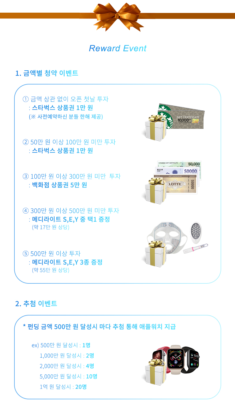 | 후원형 | 제품구매 등 | 비금전적 보상(리워드) | 문화, 복지, 아이디어상품 등 | |