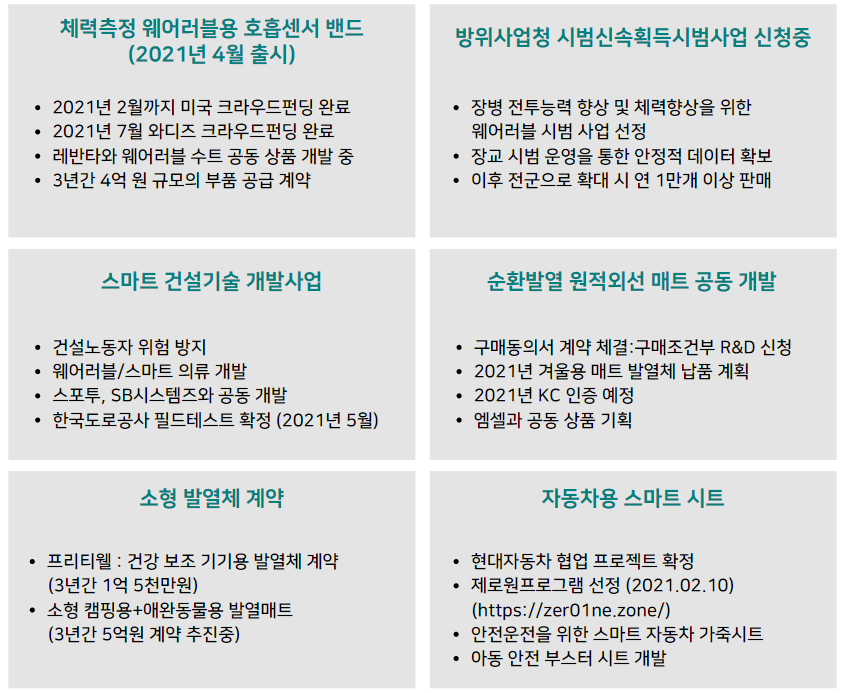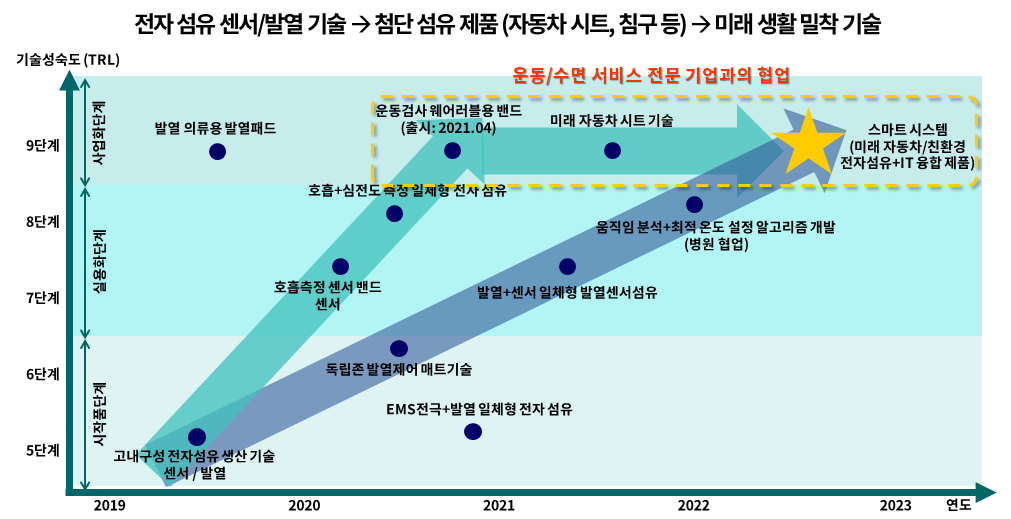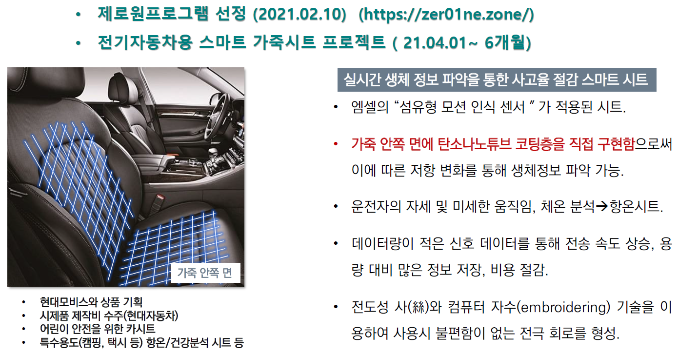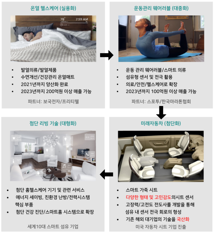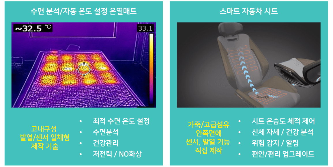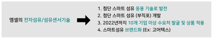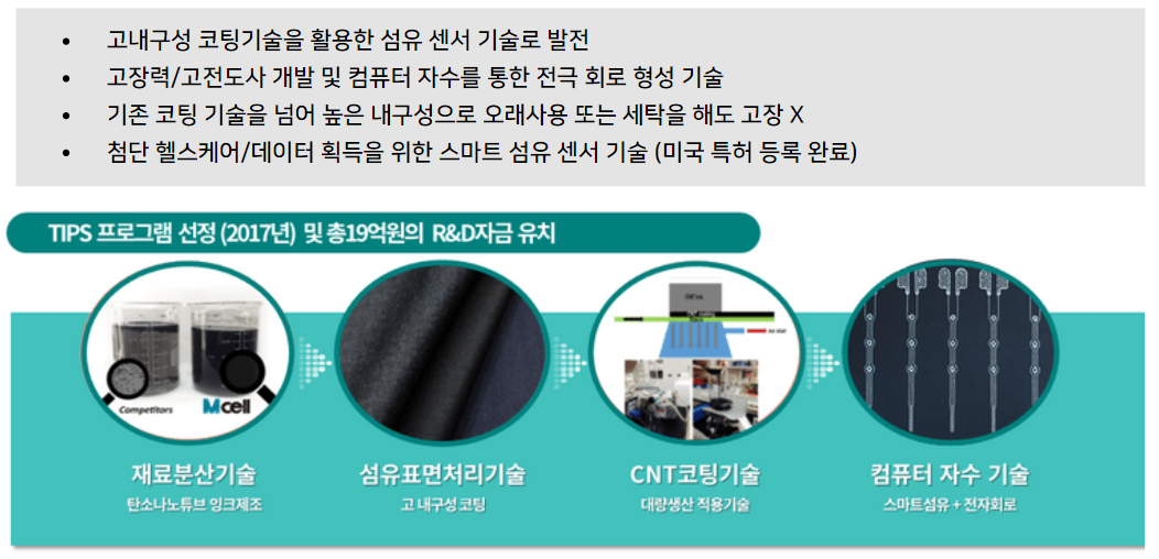 엠셀은 ICT기술과 섬유 기술을 융합한 스마트 섬유 개발 기술을 기반으로 미래 스마트 가전 및 전기자동차, 고효율 에너지소재에 적용을 진행하고 있습니다.