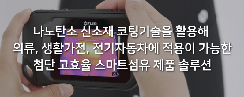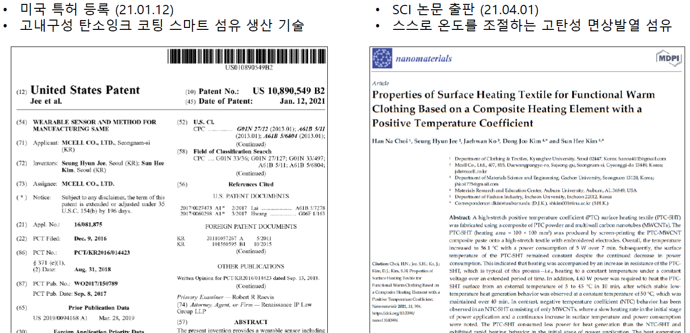 엠셀의 대표적인 기술은 사용감이 우수한 섬유에 발열/센서 물질을 고내구성으로 코팅하는 기술이며, 세라믹 코팅 및 표면 처리기술을 바탕으로 다양한 섬유 표면에 나노 탄소 신소재를 코팅 및 특수 표면처리가 가능합니다(미국 특허등록 완료).