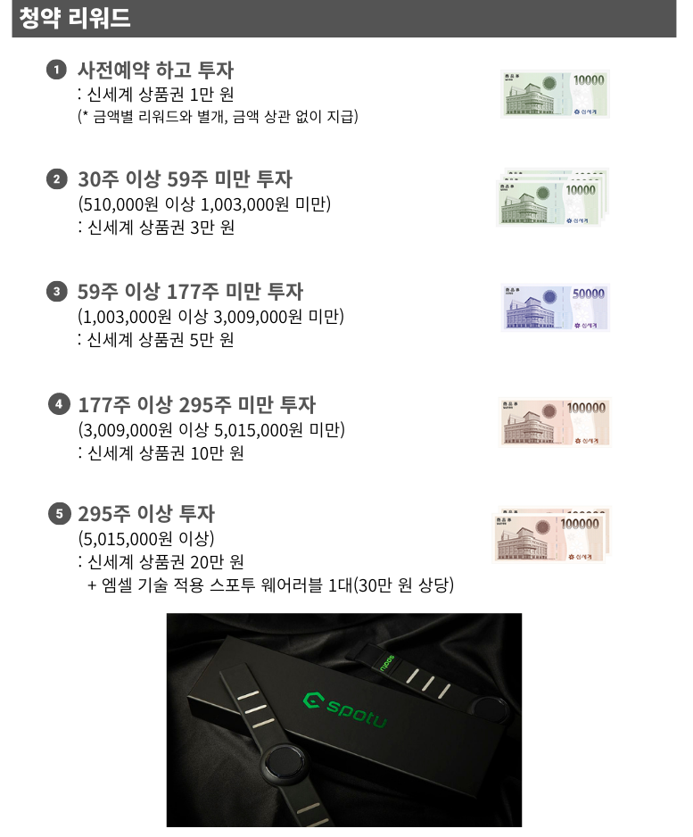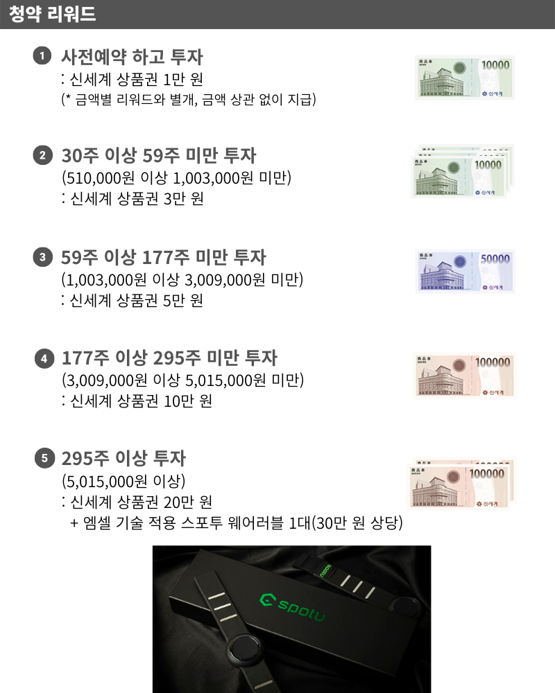1. 투자방식 : 전환사채 2. 모집 예정 금액 : 50,014,000만 원 3. 이자율 : 연리 5% (분기 단위 지급) * 이자소득세 15.4% 공제 후 지급 4. 투자기간 : 1년 (12개월) 5. 주식전환옵션 : 6개월 이후부터 보통주로 전환하여 지속 보유 가능 6. 세제혜택 : 현재 엠셀은 벤처 인증 완료 기업으로 투자금액 전액 소득공제 가능함 |