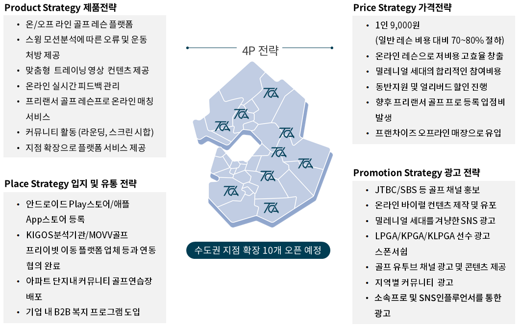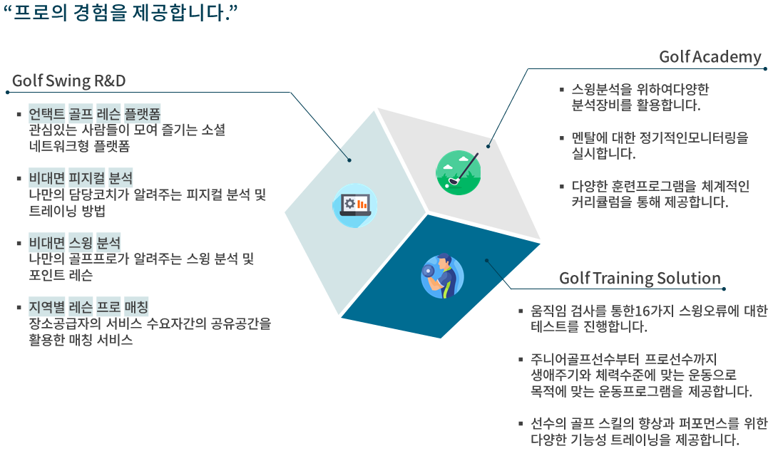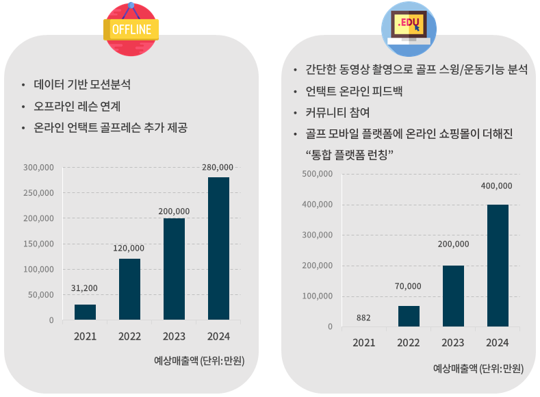엘리트 골프시장 -> 일반인 프라이빗 레슨시장 -> 온라인 컨텐츠제공 -> 통합플랫폼