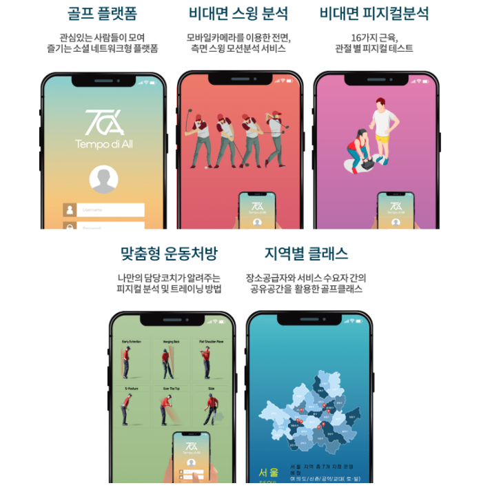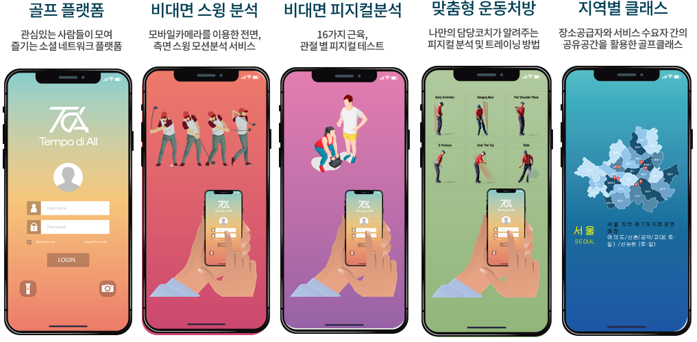 템포디올의 모바일 플랫폼은 골프를 즐기고자 하는 On-line 수요자들의 비대면 스윙분석과 피지컬분석을 통해 맞춤형 운동처방을 제공하여 골프 레슨의 시작부터 관리를 언제 어디서나 관리할 수 있는 데이터 기반의 O2O 플랫폼입니다.