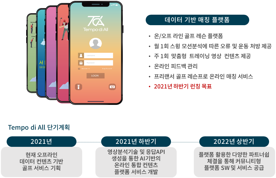 개발된 플랫폼은 2022년 하반기까지 수도권 내 10개의 프랜차이즈 오프라인 매장으로 유입되며 안드로이드 Play스토어 / 애플APP스토어, 아파트 단지내 커뮤니티 골프연습장에 배포하고 기업 내 B2B복지 프로그램을 도입 할 예정입니다.
