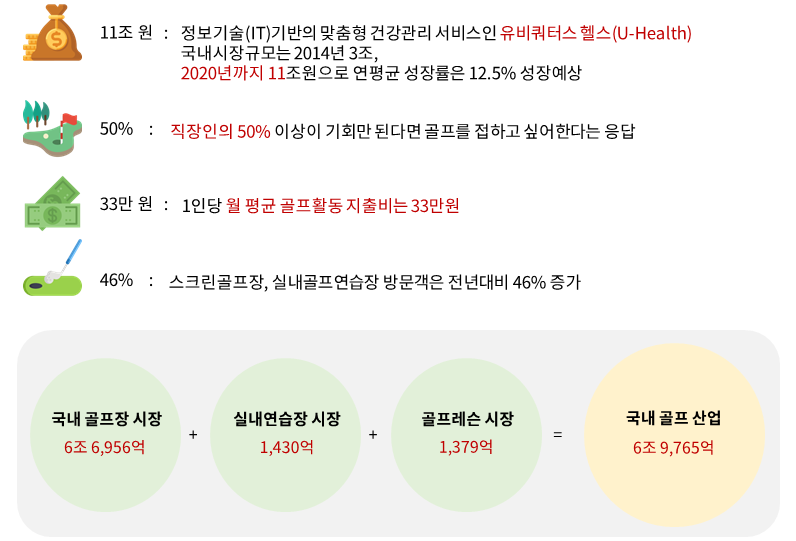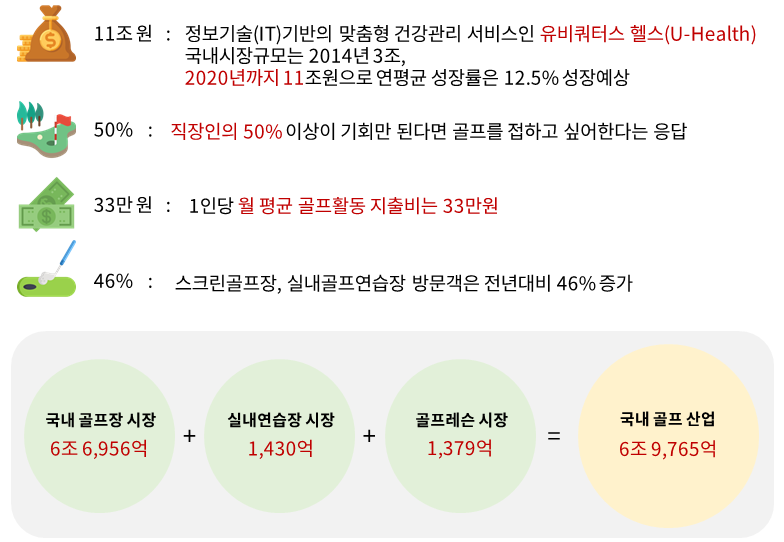 2020년부터 시작된 코로나19에 따른 경기침체에도 불구하고 골프산업은 골퍼들이 피부로 느낄 정도로 호황기를 맞이하였습니다. 현대경제연구원에서 발표한 ‘골프산업의 재발견과 시사점’에 따르면 골프산업의 스포츠 및 산업적 가치가 확대되는 양상을 보이며 시장규모가 2023년 9.2조원까지 성장할 것으로 전망됩니다.